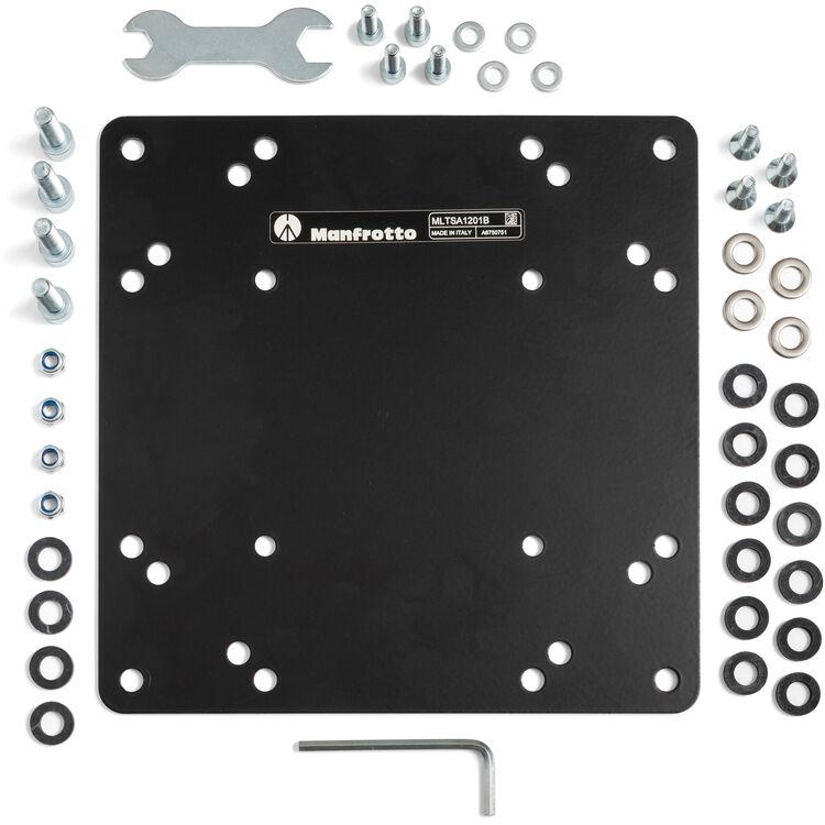 Mount a larger, heavier monitor weighing up to 66 lb when using the TetherGear VESA Monitor Mount in your video village with this TetherGear VESA Adapter Plate from Manfrotto. The durable steel mounting plate attaches to the back of the monitor, providing a solid support for large monitors. The plate supports 120 x 180mm, 180 x 120mm, 200 x 100mm, and 200 x 200mm VESA patterns. Mounting hardware is included with the plate.