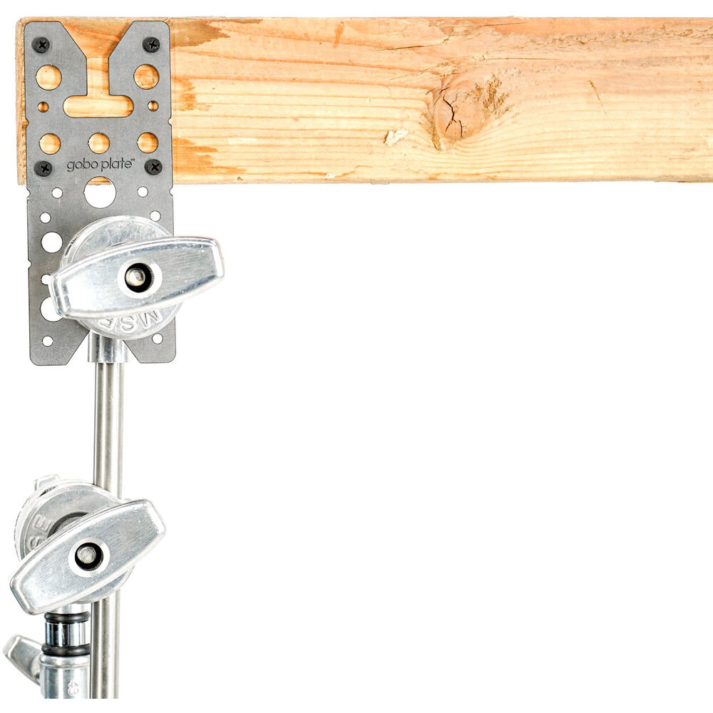 The plate features thoughtfully spaced holes for bolting on a wide variety of equipment. A standard 2.5" grip head slots into the groove at either end of the plates to securely lock down, and it mounts and releases smoothly thanks to the funnel-shaped receivers. Accessories with either 3/8" or 5/8" bolts are compatible. The plate provides flexibility in situations where space is at a premium by rigging it to a C-stand column to add an extra point for flags and scrims. It is an adaptable solution for mounting microphones above talent or cameras for tabletop shooting. Multiple scattered screw ports allow the Gobo Plate to easily integrate into wooden beams, apple boxes, or other surfaces and building materials. Matthews has conveniently machined guide notches along the side of the plate for accurate 45° mounting.