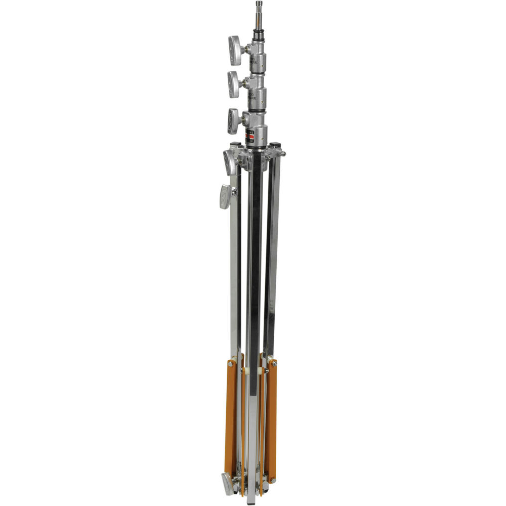 The steel-constructed, silver-finished Hollywood Beefy Baby Triple Riser Stand with Rocky Mountain Leg from Matthews has a triple riser that extends to 12.3', a stable footprint of 35.5', can support gear weighing up to 20 lb, and has a welded 5/8" Baby pin. One of the stand's special features is its leveling leg, called "Rocky Mountain Leg" by Matthews, which extends independently of the others to center the weight and provide stability on uneven surfaces.