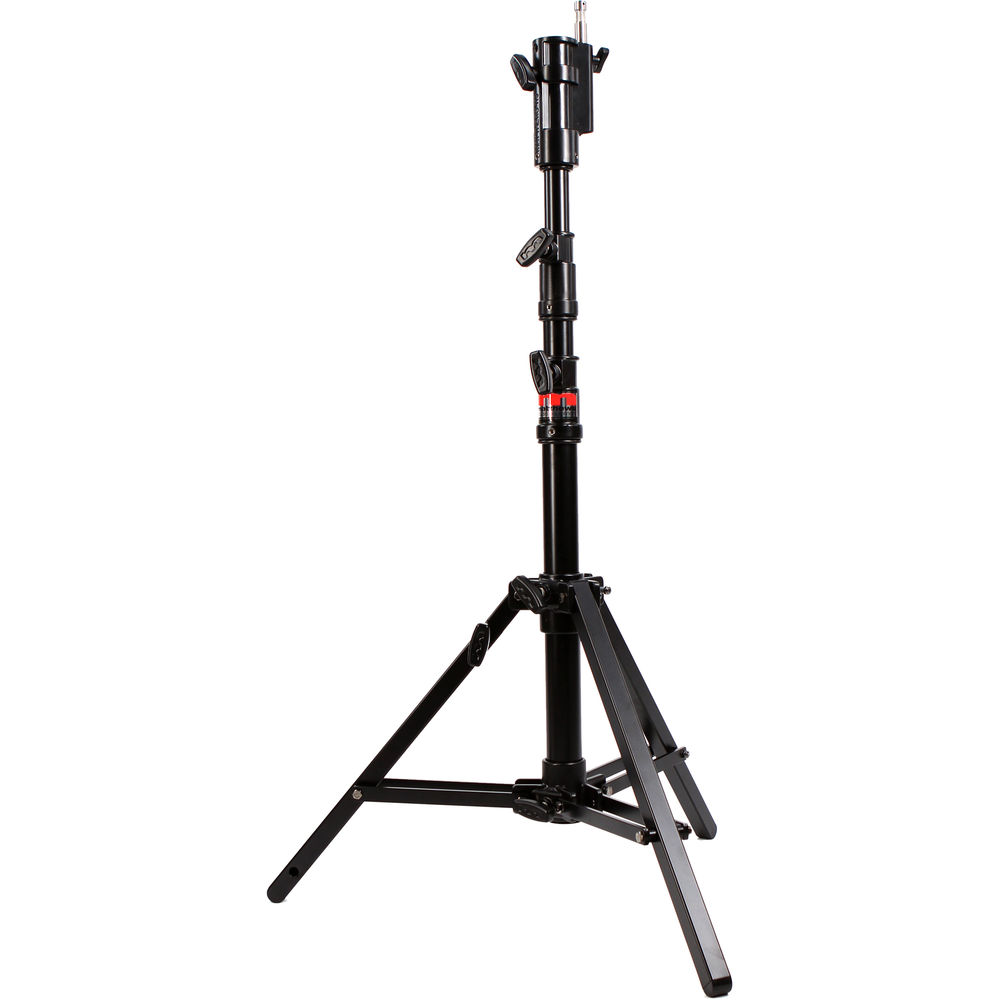 The steel-constructed Matthews Low Boy Double Riser Combo Stand, in a black powder coat finish, rises to a maximum height of 6.4' and can support gear weighing up to 72 lb. The stand has a wide 31" footprint for maximum stability and a Rocky Mountain leg that extends independently of the others to center the load on uneven surfaces. The Low Boy Double Riser has a 1 1/8" Junior receiver and a retractable 5/8" pin. It will accept optional #366068 Combo Adapter Wheels.