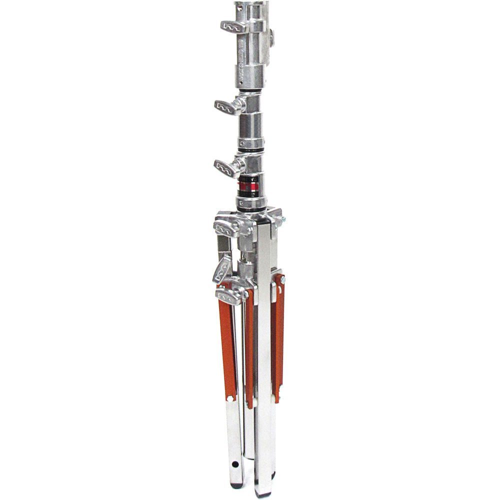 The steel-constructed Matthews Low Boy Double Riser Combo Stand, in a silver finish, rises to a maximum height of 6.4' and can support gear weighing up to 72 lb. The stand has a wide 31" footprint for maximum stability and a Rocky Mountain leg that extends independently of the others to center the load on uneven surfaces. The Low Boy Double Riser has a 1 1/8" Junior receiver and a retractable 5/8" pin. It will accept optional #366068 Combo Adapter Wheels.