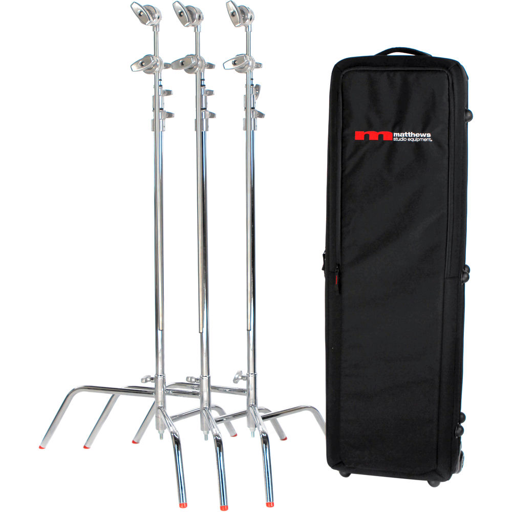 Matthews has put together this Trio C+ Traveler Kit for image-makers who need to take a heavy-duty support system on the road. The kit includes three 10.5' C-stands, each with a removable Turtle Base, a 40" riser, a 2.5" grip head, and a 40" gobo arm. The wheeled kit case is included to store all the components.