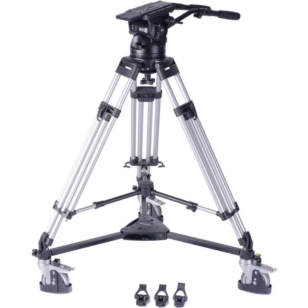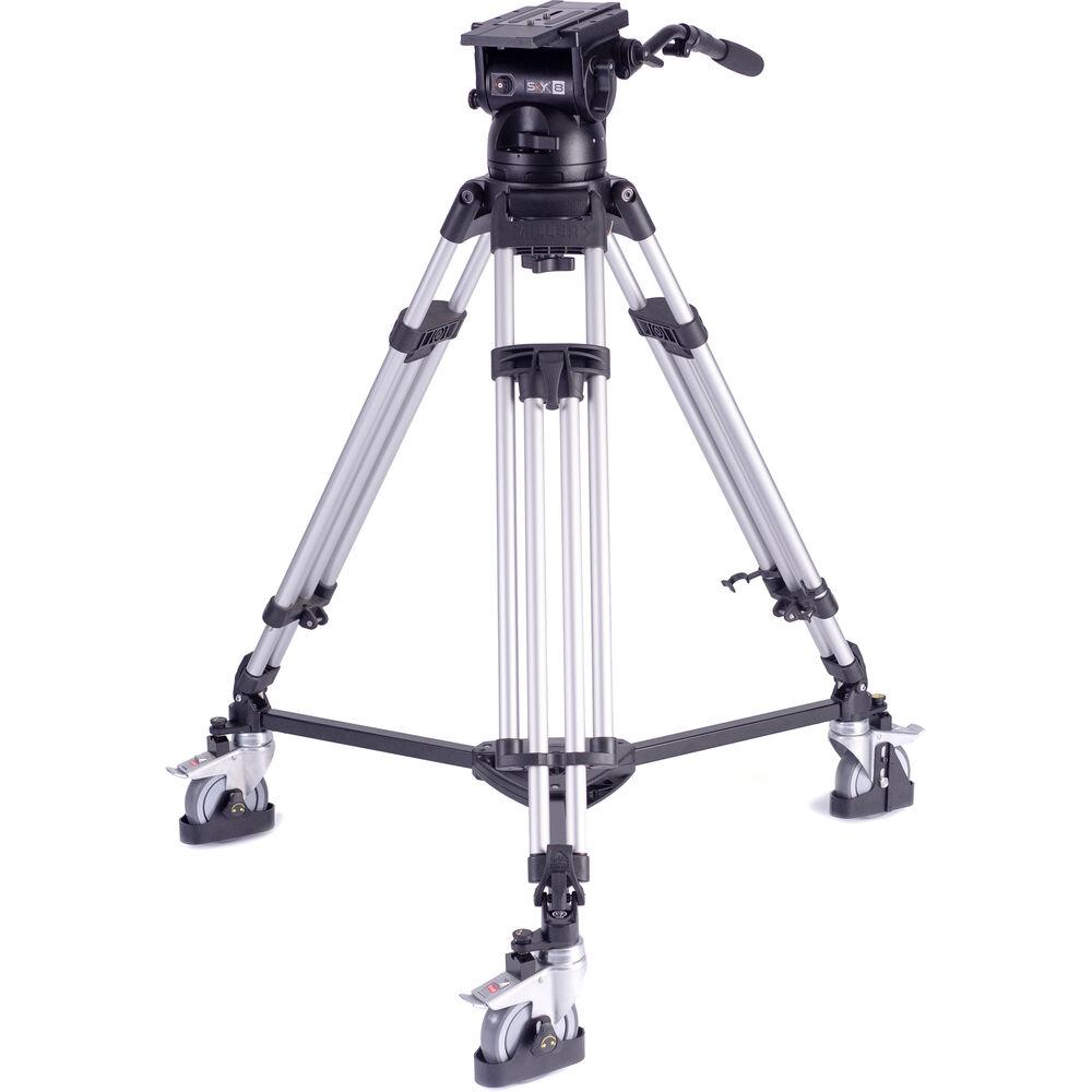 The SkyX 8 Fluid Head, HD 1-Stage Alloy Tripod, Mid-Level Spreader, Dolly & Rubber Feet Kit from Miller includes the SkyX 8 fluid head, dual pan handles, a quick release plate, HD 1-stage alloy tripod legs, a mid-level spreader, a studio tracker tripod dolly, and a rubber foot set.