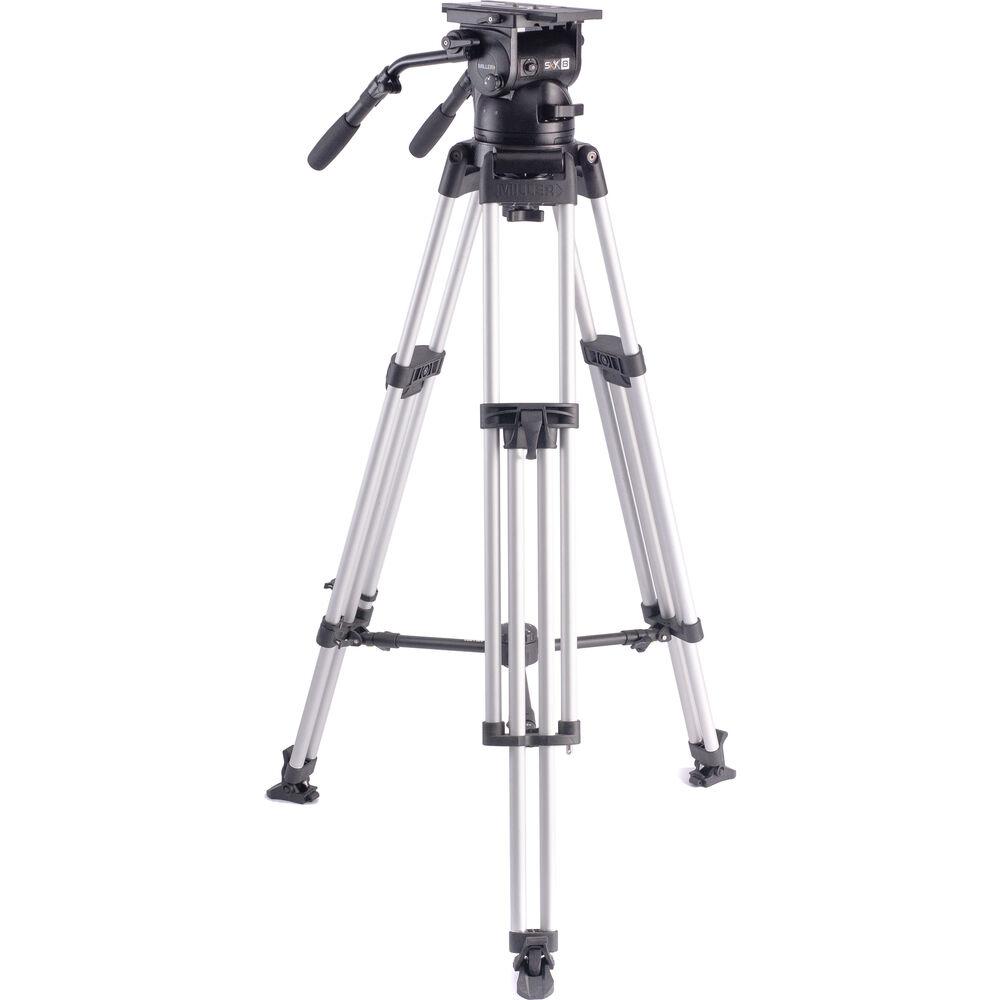 The SkyX 8 Head, HD 1-Stage Alloy Tripod, Mid-Level Spreader, Rubber Feet Kit from Miller includes the SkyX 8 fluid head, dual pan handles, a quick release plate, HD 1-stage alloy tripod legs, a mid-level spreader, and a rubber foot set.