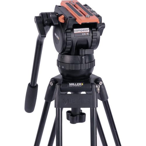 The Versa CXV6 Head, Toggle 2-Stage Alloy Tripod, Ground Spreader & Soft Case Kit from Miller includes the Versa CXV6 fluid head, a pan handle, a quick release plate, the Toggle 75 2-stage alloy tripod legs, a ground spreader, a shoulder strap for the tripod, a rubber foot set, and a soft carry case.