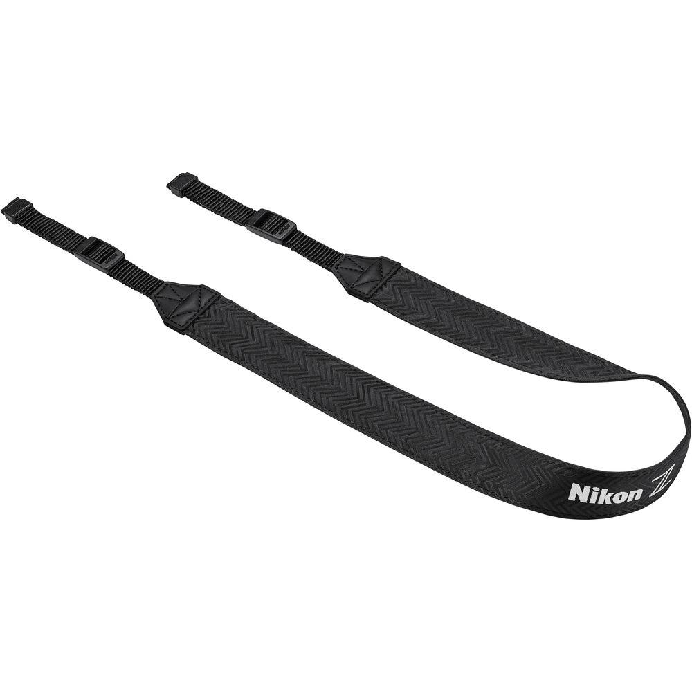 The AN-DC23 Strap for Nikon Z fc Digital Camera is a neck strap that comes with select Nikon Z cameras. It features an all-black herringbone design with the name Nikon Z in white.