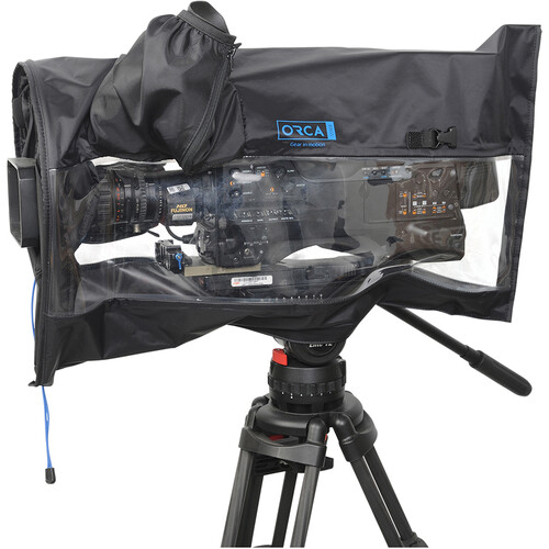 Protect your cinema camera or camcorder in inclement weather with the OR-107 Quick Rain Cover from ORCA. This rain cover is made from durable nylon fabric and features large, clear windows so you can view your controls. It keeps rain, snow, wind, and dust from affecting your camera or camcorder during outdoor shoots. The cover easily slips over the camera and tightens around the lens via a bungee cord. Hook-and-loop fasteners at the bottom of the cover allow you to slide it on and off while the camera is mounted to a tripod. Use the side sleeve to adjust the camera's viewfinder or an attached front microphone.