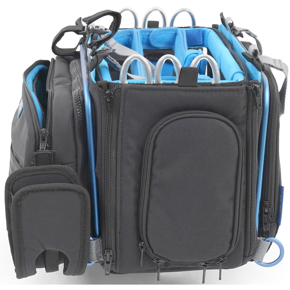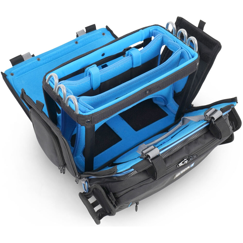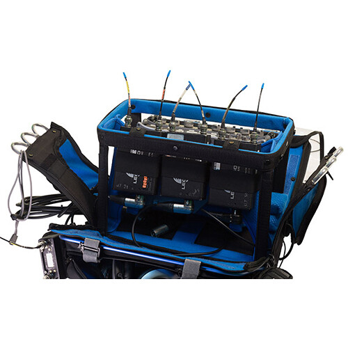 The bag's aluminum frame allows for access to the gear from six directions and its bright blue polyester lining provides easy viewing of the equipment. The top clear TPU allows you to see your gear without opening the bag. The bag features two pockets for accessory storage, front bungee cords to hold a boompole or cables, external detachable pouches, and 9 rubber bands to support your wireless system.