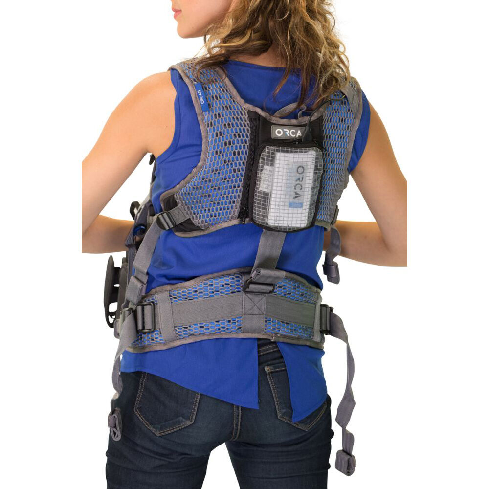 The OR-40 utilizes an EVA skeleton with mesh fabric to ensure light weight and breathability while the padded back increases comfort. A special sliding system adjusts, so the harness can fit any operator of any size. The OR-40 can be attached to any ORCA audio bag and allows separate use of the top and bottom sections.