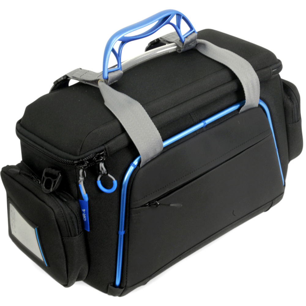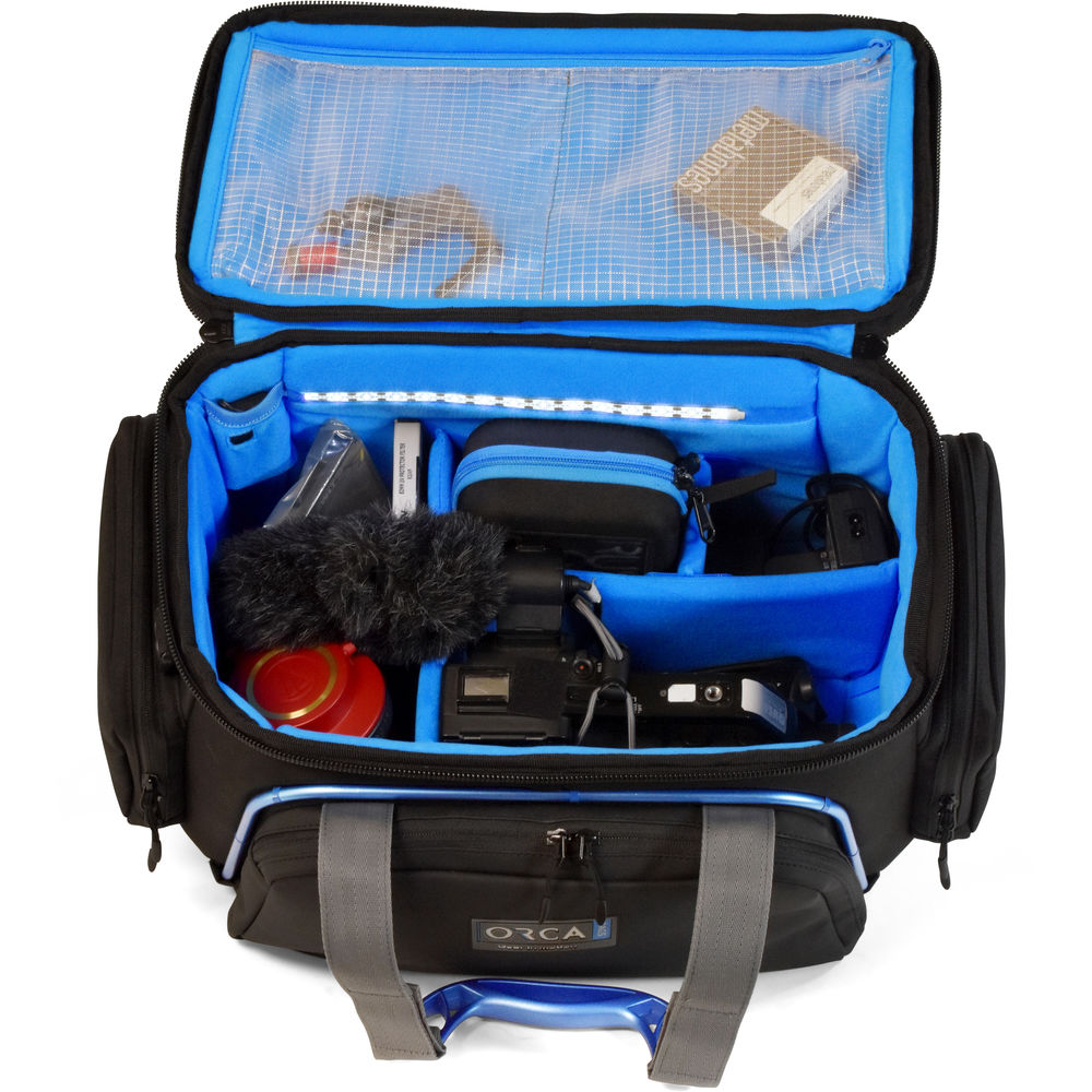 The Orca OR-5 Shoulder Video Camera Bag is designed to store, carry, and protect a video camera up to approximately 5" in length, plus accessories. It features an external blue anodized aluminum frame, an internal honeycomb frame, and layers of foam and EVA padding to protect your camera and keep the bag from collapsing. Internal adjustable dividers allow you to customize the case interior so your camera and accessories fit snugly.