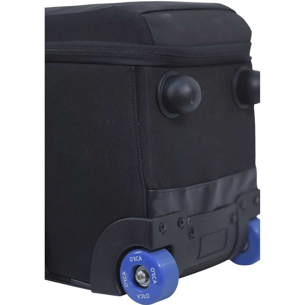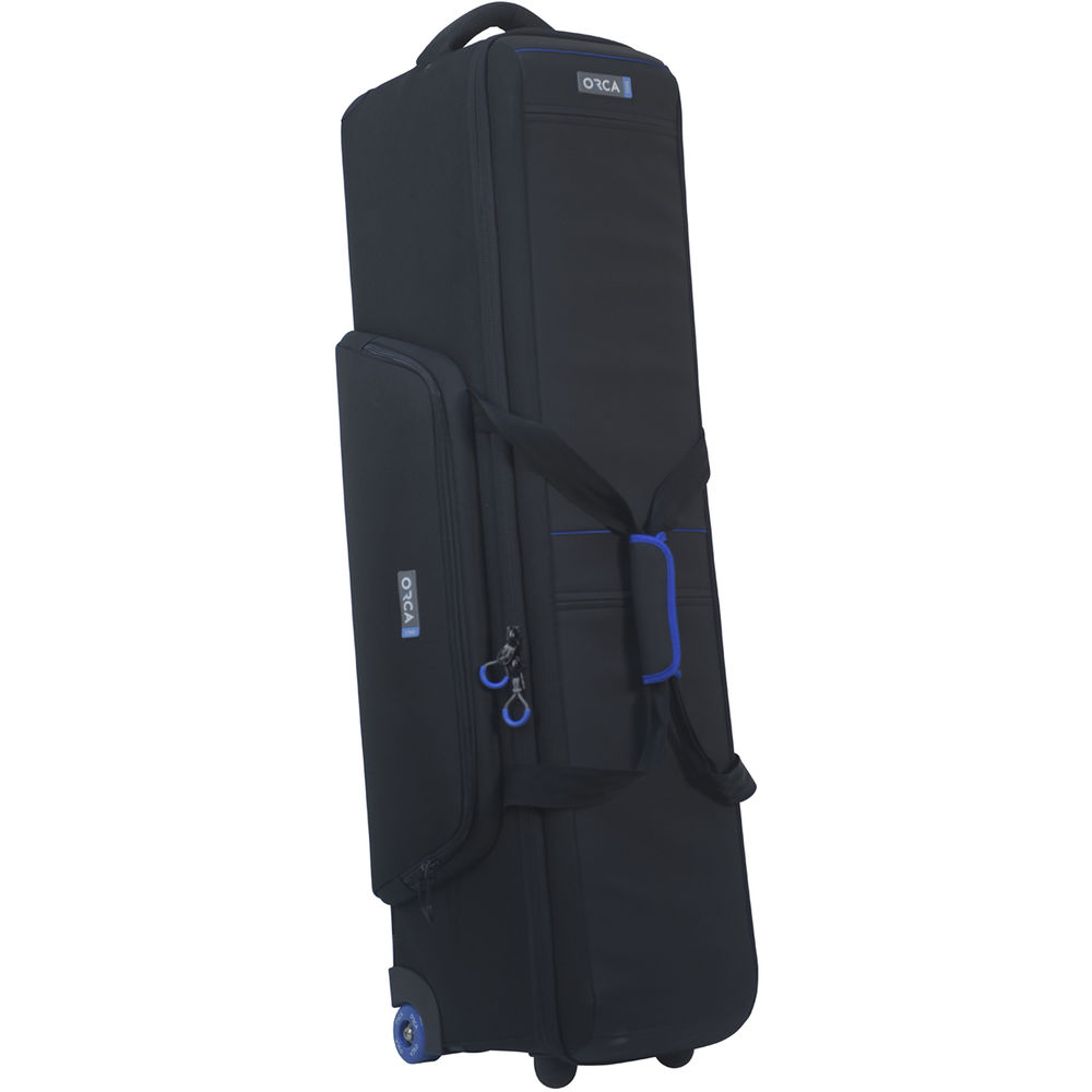 Store, transport, and protect your up to 37" tripod and stands with the medium, black OR- 74 Wheeled Tripod Bag from ORCA. The zippered main compartment is padded and features an inner zip pocket, lid pocket, adjustable straps to secure gear, and a head mark to help position the tripod in the correct side. Additional accessories are easily stored in the exterior zip pocket. Carry the case by the dual, connecting top handles, or haul with the padded top handle and wheels. The bottom of the case has two rubber feet for upright standing. Around the wheels and lower rear of the case is a protective plastic skid plate.