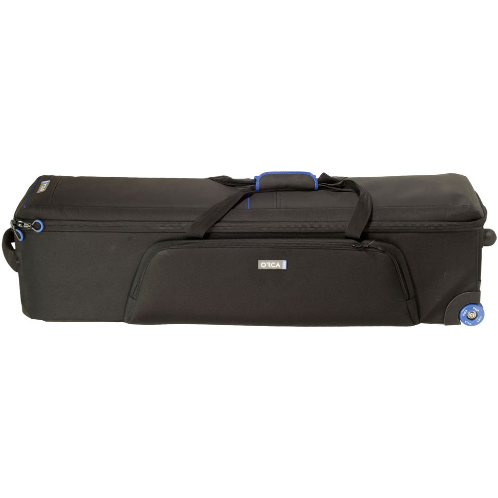 The large Video Camera Tripod Bag from Orca is designed to carry ENG and EFP heavy-duty tripods. The bag is protected from all sides with Orca Bag's honeycomb frame and plastic injection bottom protection. The bag has strong skate wheels, carrying handles, a large external pocket for accessories, and two external buckles to attach a shoulder carrying strap (sold separately).