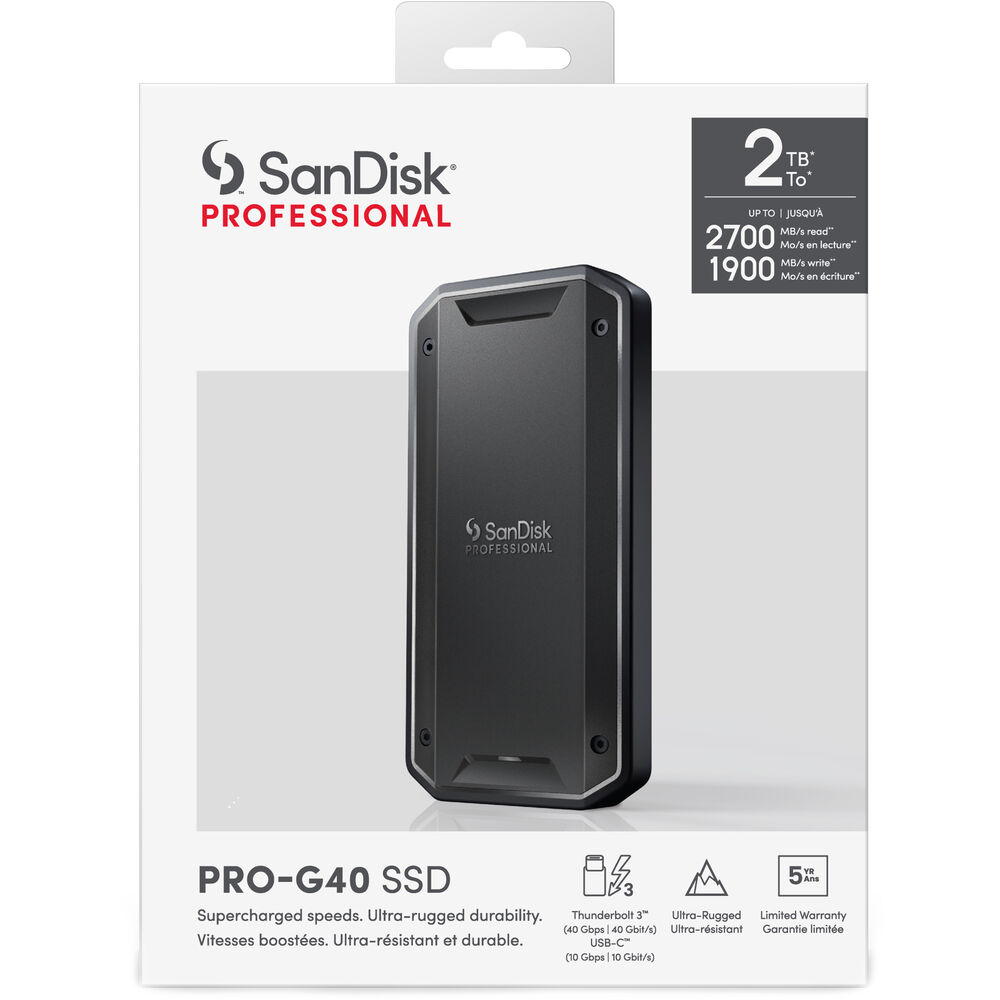 No matter where your adventures may lead, the 2TB SanDisk Professional PRO-G40 SSD helps you store your important footage, including large raw images and 4K video files. Featuring a tough, rugged design, this portable solid-state drive is IP68 rated for water and dust resistance in addition to withstanding up to 9.8' drops and 4000 pounds of crushing force. At the same time, the aluminum core helps to quickly dissipate heat to maintain read speeds of up to 3000 MB/s and write speeds of up to 2500 MB/s when connected to a Thunderbolt 3 compatible system — meaning that you can transfer 50GB of data in about a minute. The PRO-G40 SSD also works with USB-C 3.2 Gen 2 devices at up to 1050 MB/s and 1000 MB/s read and write speeds, respectively, making it an ideal scratch drive for high-resolution editing and rendering.