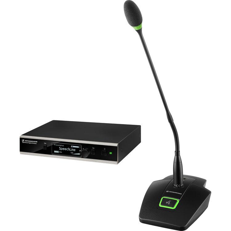 The SpeechLine Digital Wireless Microphone Set from Sennheiser includes an SL Table Stand 153-S DW, a MEG 14-40-L-II B gooseneck microphone with integrated LED ring, an SL Rack Receiver DW with power supply, a BA 40 rechargeable battery, and a rackmount kit. Optimized for speech transmission, this flexible wireless set offers speech intelligibility and ease of use for meeting participants, in conference rooms, offices, and huddle rooms.