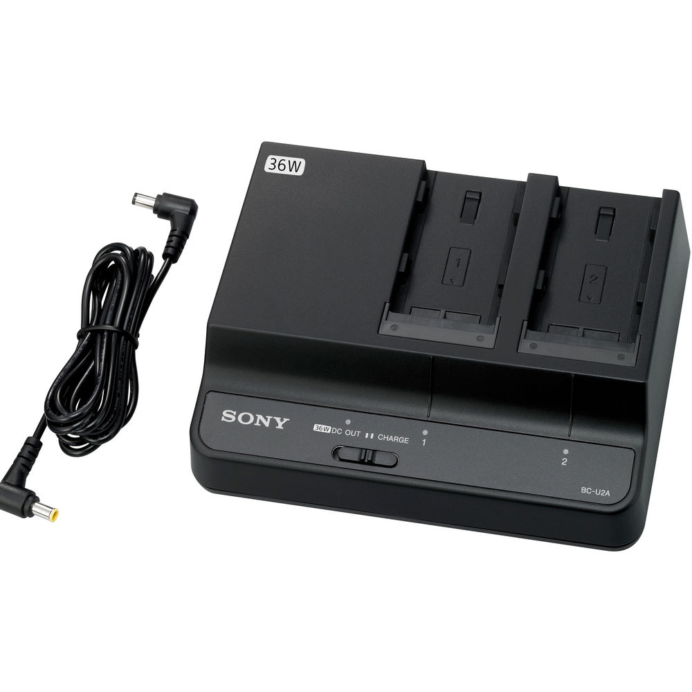 The Sony BC-U2A Dual-Bay Battery Charger / AC Adapter is a dual-bay charger that supports the simultaneous charging of two Sony BP-U90, BP-U60, BP-U60T, or BP-U30 Li-ion batteries. It also functions as an AC adapter that can be used to power a camera directly while also charging one battery simultaneously. The AC adapter provides a 12 VDC power output via an integrated cable that can be connected to any Sony camera that accepts BP-U series batteries. A selector switch on the front of the device allows you to switch between charger and AC adapter mode.