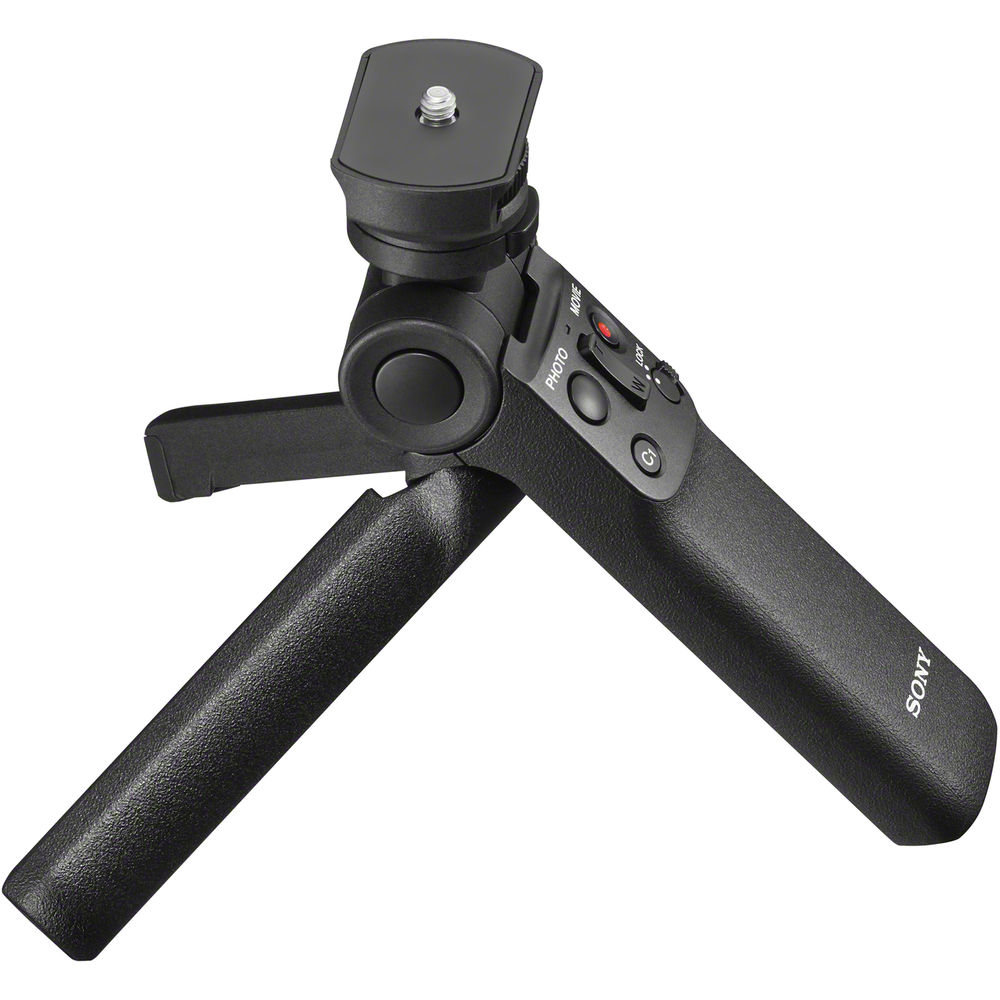 Helping to improve shooting stability, the Sony GP-VPT2BT Wireless Shooting Grip is a convenient tool that serves as both a larger grip for handheld shooting as well as a sleek tabletop tripod. Compatible with select Sony cameras featuring Bluetooth connectivity, this grip offers wireless control over select shooting controls, via built-in shutter release and video record buttons, a zoom rocker switch, and a customizable C1 button. Beyond serving as just an accessory grip, the grip itself can be splayed into three legs and function as a tripod for hands-free shooting. The integrated head can tilt upward 80° (40° when setup as a tripod), downward 90°, and rotate 360° for easier positioning. Additionally, the grip is dust and moisture-resistant to suit its use with select weather-sealed cameras.