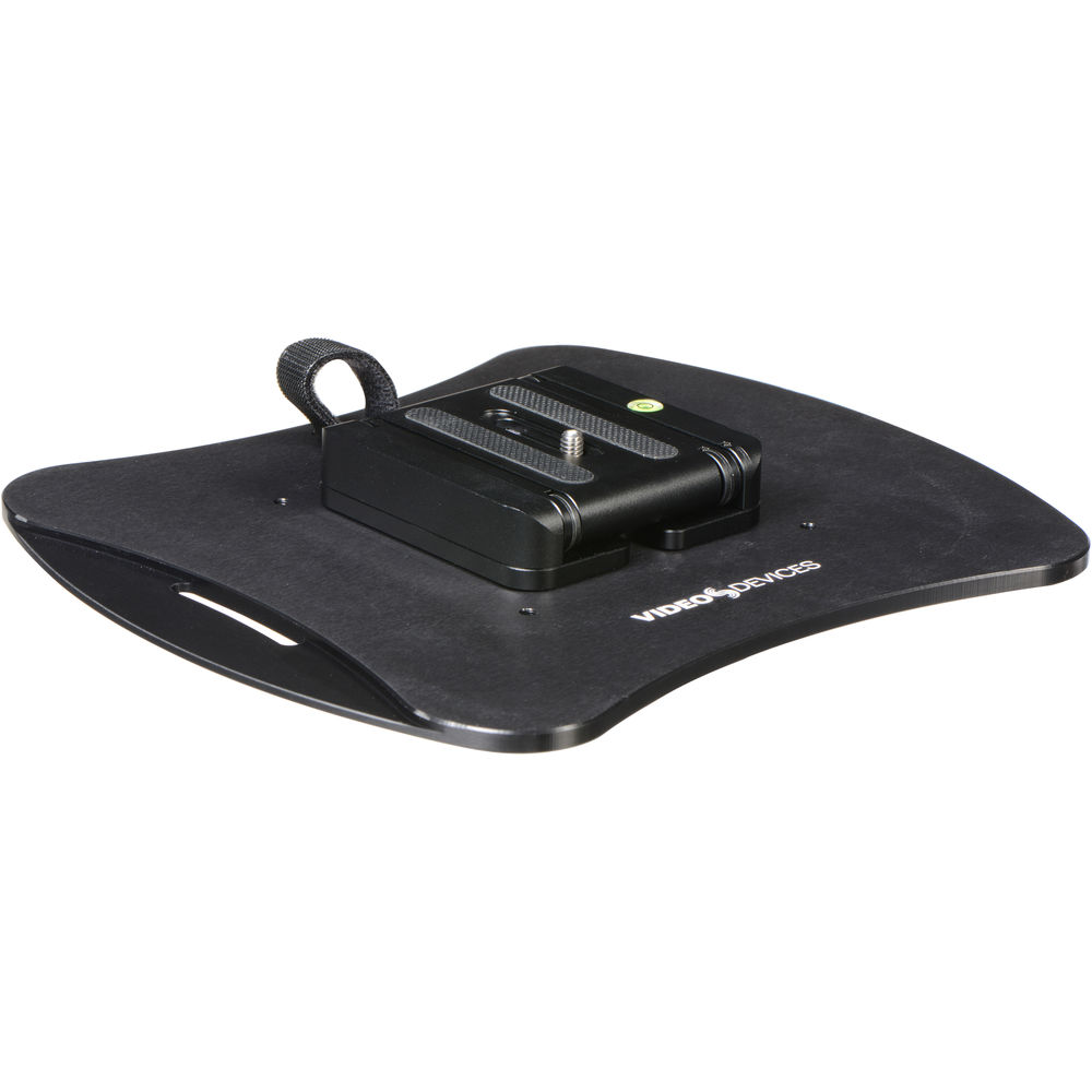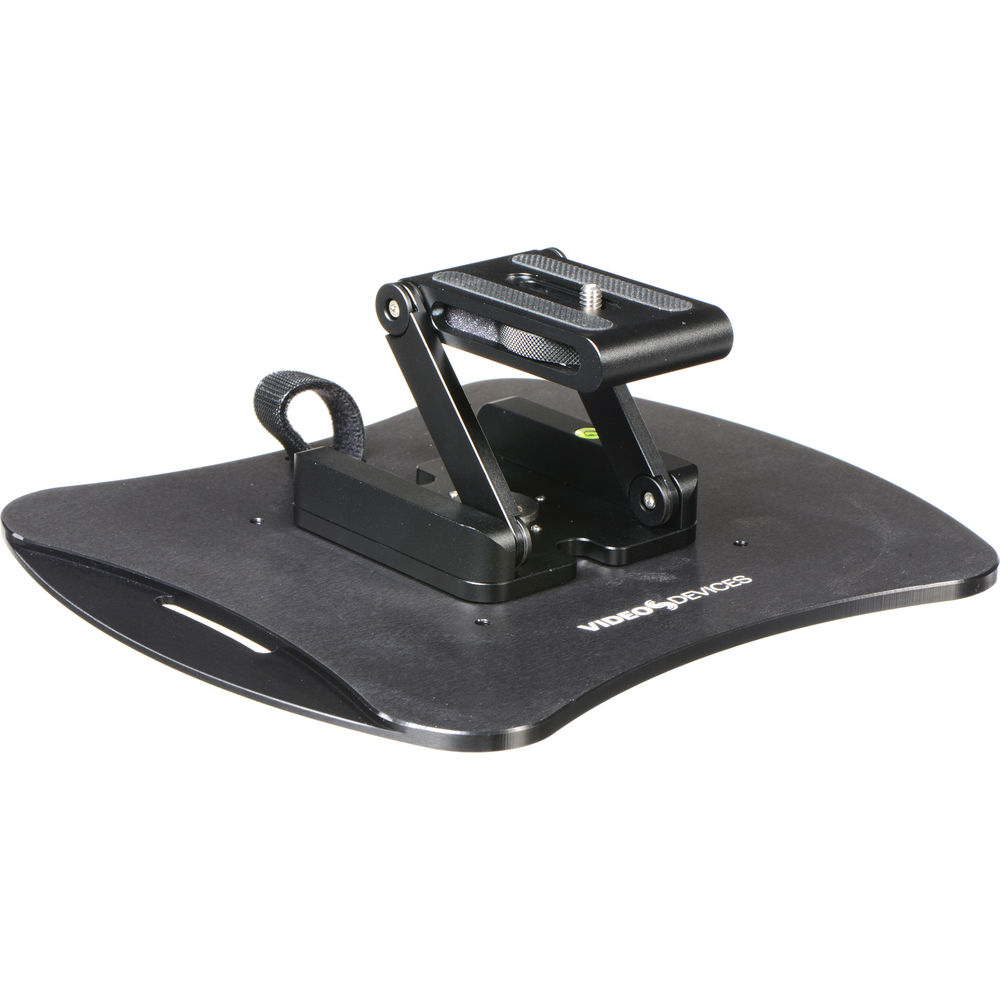 When your PIX recorder is not secured atop a camera, the Video Devices PIX-Base gives you a flexible flat-surface mounting solution. PIX monitors can be secured using the 1/4"-20 thread on top of the mounting platform. The mounting platform is adjustable for height and tilt for the best viewing angles, while an integrated bubble level ensures that the PIX-Base is mounted on an even surface. Rubber grips underneath the base prevent unwanted movement and surface scratching. An interlocking design allows multiple units to be attached in multi-recorder setups for a clean, organized look. Additionally, any cables can be secured using the integrated hook-and-loop strap. Once your production day is done and the monitor has been put away, the PIX-Base is easily collapsible to conserve storage space. Screw holes in the base can be used for more permanent installations.