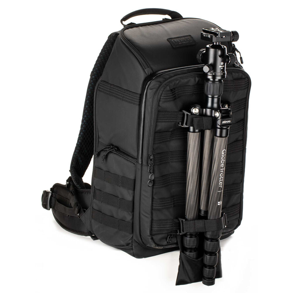 The updated black, 24L Axis V2 Backpack from Tenba is built for the working professional, content creator, photographer, or filmmaker. The pack holds two mirrorless or DSLR cameras, eight 2.8mm lenses, a 16" laptop, and a compact drone. This backpack is the first to include a hidden neoprene pocket that holds an Apple AirTag or Tile Bluetooth Tracker. The MOLLE webbing all around the exterior of the pack allows you to add additional Tenba accessories, including lens capsules, battery pouches, and card wallets. Tenba's exclusive Airflow harness and auto-adjusting Pivot-Fit straps mean the pack will fit, no matter what shape or size you are. The bag has unique dual sternum straps to ensure superior load-balancing across the chest, and allowing female users to position the straps above or below the bust for superior comfort. One of the sternum straps can be removed, if desired. A reversible rain cover is included, one side is black and the other silver to reflect UV rays.