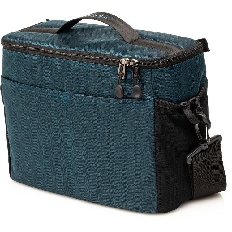 The blue BYOB 10 Camera Insert from Tenba is designed to carry and protect a camera and gear inside other non-camera bags including larger backpacks, suitcases, or handbags. Its soft outer shell molds to the shape of many different types of bags. The BYOB 10 will hold a DSLR or mirrorless camera body with up to 4 lenses and accessories including an attached 24-70mm f/2.8. Padded interior dividers are adjustable to fit multiple configurations and the soft-brushed tricot-lined interior will not scratch your equipment. The insert features a zippered top cover that can be folded back and stowed to allow easy access to your gear plus a handle for carrying and quick removal of the insert. Stretch mesh pockets provide a place to store your phone, camera and lens accessories, or other items. The zippered interior pockets secure smaller more valuable items. In addition there are front and rear pockets for acessories and a D-ring to attach keys, a carabiner, or a tethered media walle