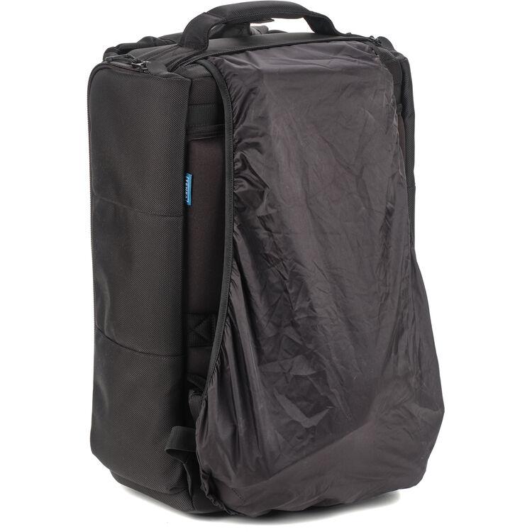 The 29L Cineluxe V2 Backpack 21 in black from Tenba accommodates compact mirrorless, DSLR, or cinema cameras up to 18.5" long, plus assembled accessories. It features a doctor bag-style opening down the middle for easy access to stored gear and maintaining the bag's footprint when opened. Upgrades to the V2 design include a hidden AirTag tracker pocket, MOLLE webbing on the exterior, lockable zippers, and a reversible rain cover to protect your gear from the elements.