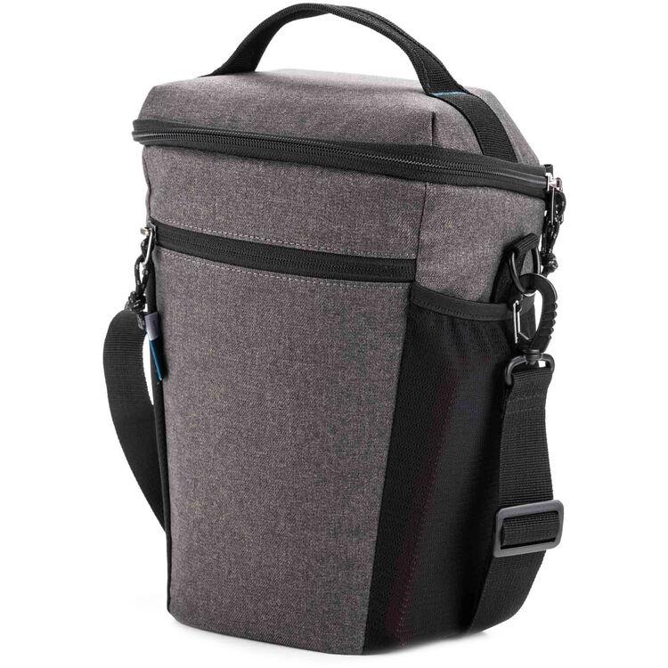 The gray Skyline V2 Top Load 9 Camera Bag from Tenba is designed to protect a mirrorless or DSLR with a lens up to 6" plus memory cards, batteries, and other accessories during storage and transport. The lid opens away from your body, so it won't interfere when you want to quickly remove your gear. This bag is made from water-repellent fabrics and features YKK zippers. The reinforced stitching ensures long-term durability. Expandable side mesh pockets stretch to hold water bottles or other accessories. The interior zippered pocket is ideal for storing memory cards and batteries.