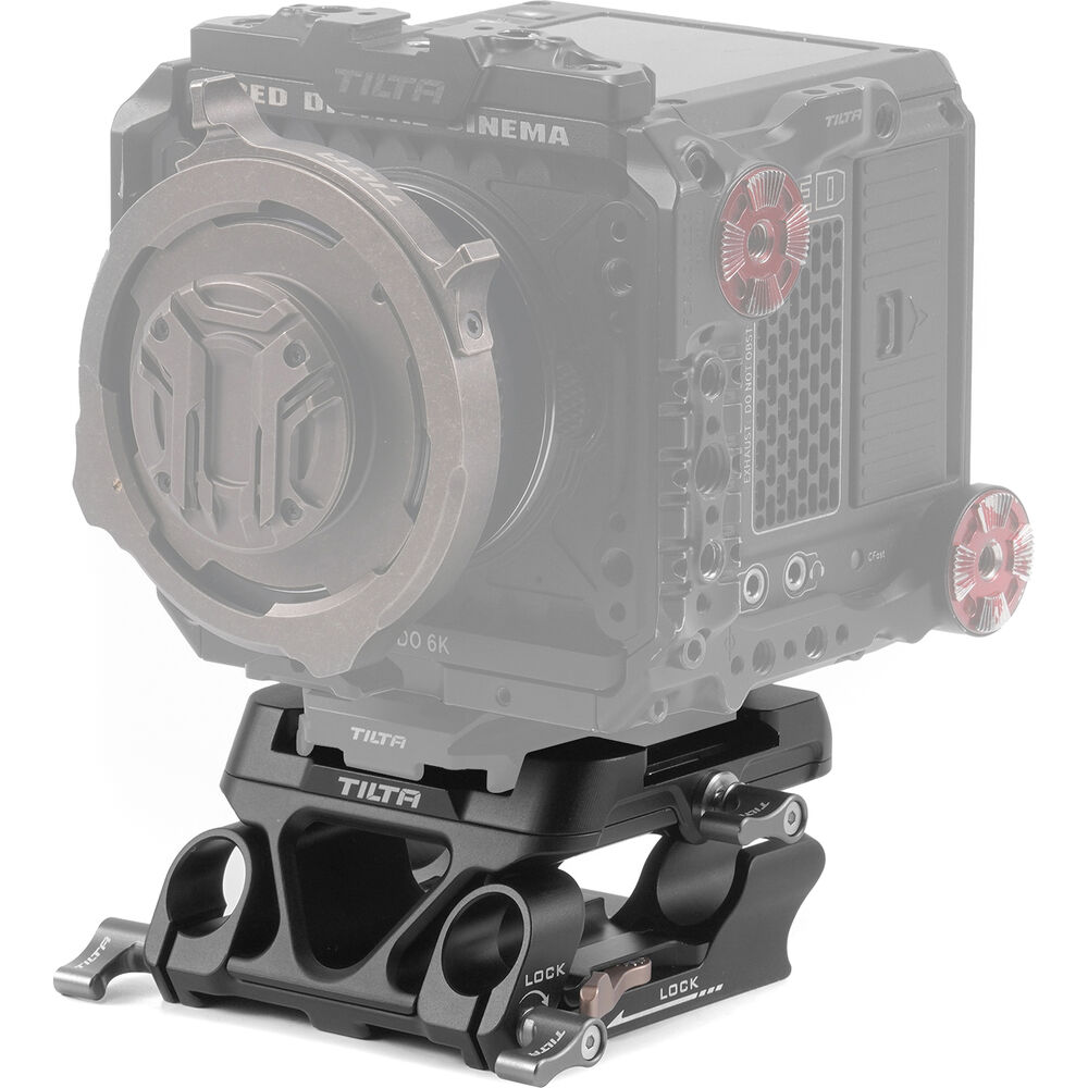 The bottom of the baseplate mounts on Tilta standard dovetails using a locking design, and it features 1/4"-20 and 3/8"-16 threads for mounting onto a variety of rigs and plates. Built into the baseplate is a pair of LWS 15mm rod clamps with spring-loaded locking levers.