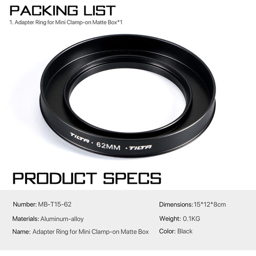 This Tilta 62mm Adapter Ring allows you to mount the Tilta Mini Clamp-On Matte Box on lenses that have a 62mm front diameter. The adapter ring screws onto the front of the lens, and the matte box then clamps onto the adapter ring. The thumbscrew on the side of the matte box is used to secure the matte box firmly to the adapter ring. The adapter ring also provides a thread for attaching 62mm screw-on filters to the lens. This is done right before mounting the matte box. After attaching the adapter ring to the lens, screw on the filter to the provided thread, and then attach the matte box. The adapter ring is made of aluminum and comes in black.