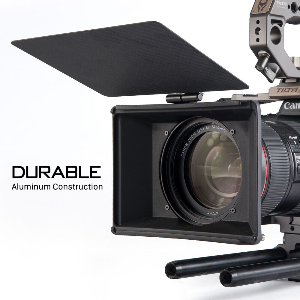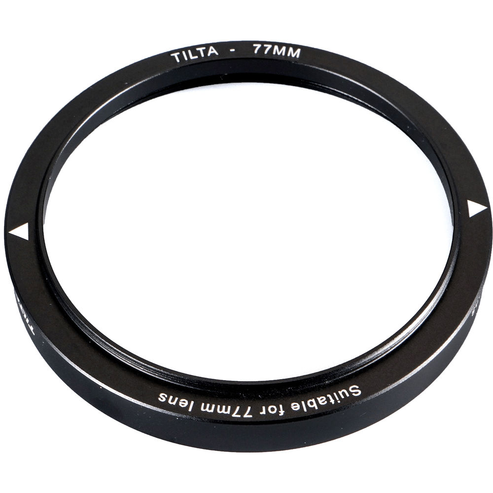 This Tilta 77mm Adapter Ring allows you to mount the Tilta Mini Clamp-On Matte Box on lenses that have a 77mm front diameter. The adapter ring screws onto the front of the lens, and the matte box then clamps onto the adapter ring. The thumbscrew on the side of the matte box is used to secure the matte box firmly to the adapter ring. The adapter ring also provides a thread for attaching 77mm screw-on filters to the lens. This is done right before mounting the matte box. After attaching the adapter ring to the lens, screw on the filter to the provided thread, and then attach the matte box. The adapter ring is made of aluminum and comes in black.