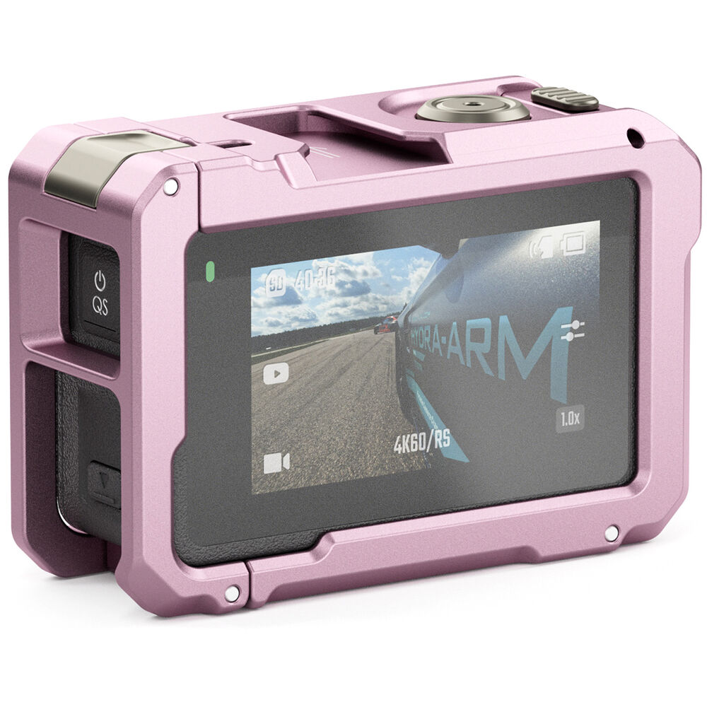 The pink Basic Camera Cage Kit from Tilta offers 360° protection for your Osmo Action 3 camera while maintaining access to all ports and controls. The kit includes a formfitting full camera cage and a magnetic mounting baseplate.
