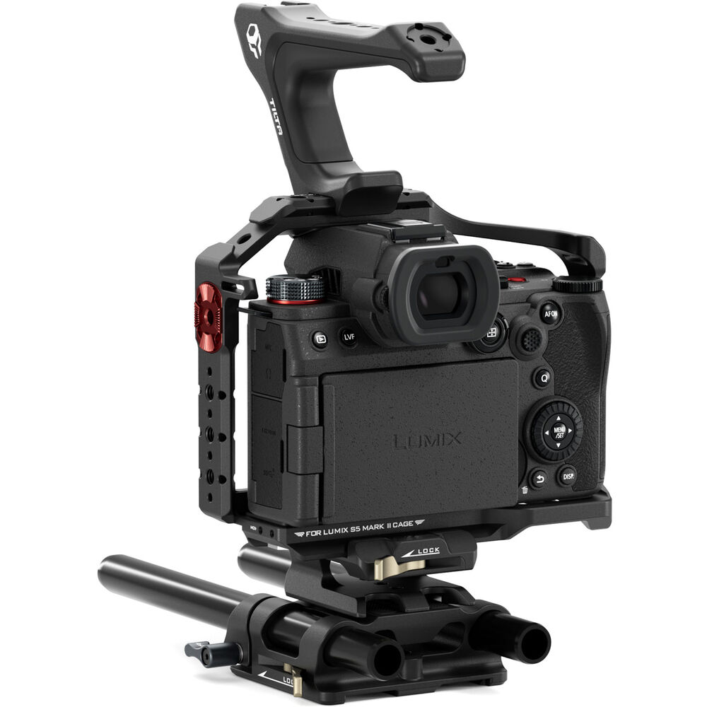 Carry, protect, and accessorize your Panasonic S5 II or S5 IIX camera with this black Basic Kit from Tilta. This kit includes a full camera cage, a compact NATO top carry handle, a 15mm LWS baseplate, an LWS baseplate adapter, and an HDMI/USB-C cable clamp.
