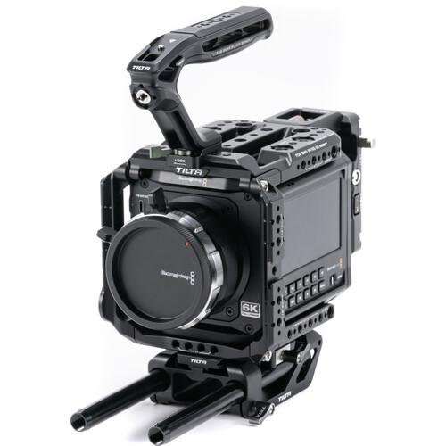 Mount accessories and add handheld capabilities to your Blackmagic Design PYXIS 6K or PYXIS 12K cinema camera with the black Camera Cage Pro Kit from Tilta. The kit includes a modular full camera cage, a Xeno top handle with a NATO clamp, a 15mm LWS baseplate, and two 8" long 15mm rods.