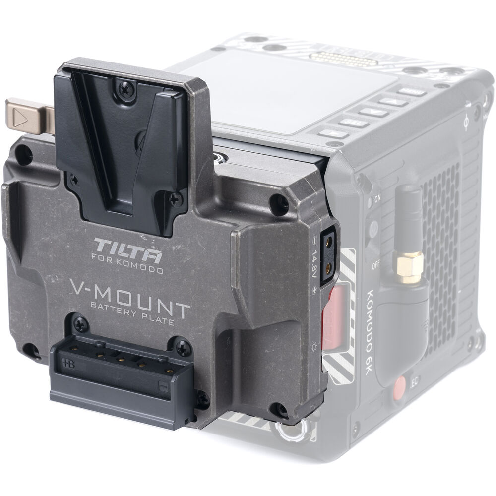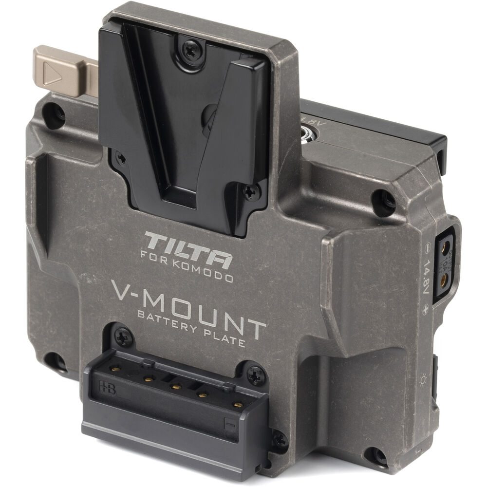 Power your RED KOMODO with an optional V-mount battery using this tactical gray Dual Canon BP to V-Mount Adapter Battery Plate for RED KOMODO from Tilta. The aluminum alloy and stainless steel adapter mounts directly onto the camera's BP battery slots in a vertical position and provides two 14.8V D-Tap ports, two 14.8V 2-pin LEMO ports, and one 5V USB port to power accessories, such as an external monitor, an LED light, or a wireless follow focus system.