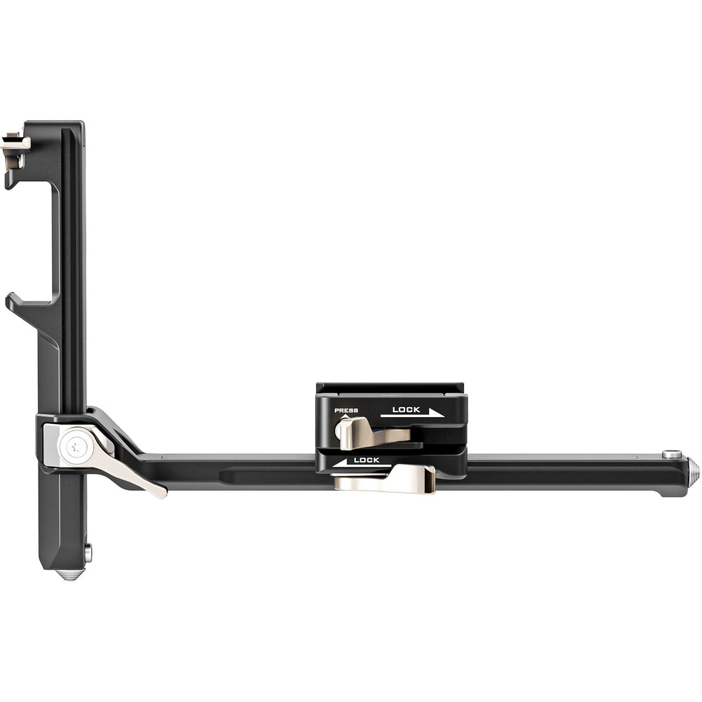The arm extends the arm 0.8" longer vertically than the original, and the horizontal arm measures 4.4", lowering the center of gravity for easier mounting. The quick release receiver accepts the original plate, and it rotates 360° to assist in balancing.
