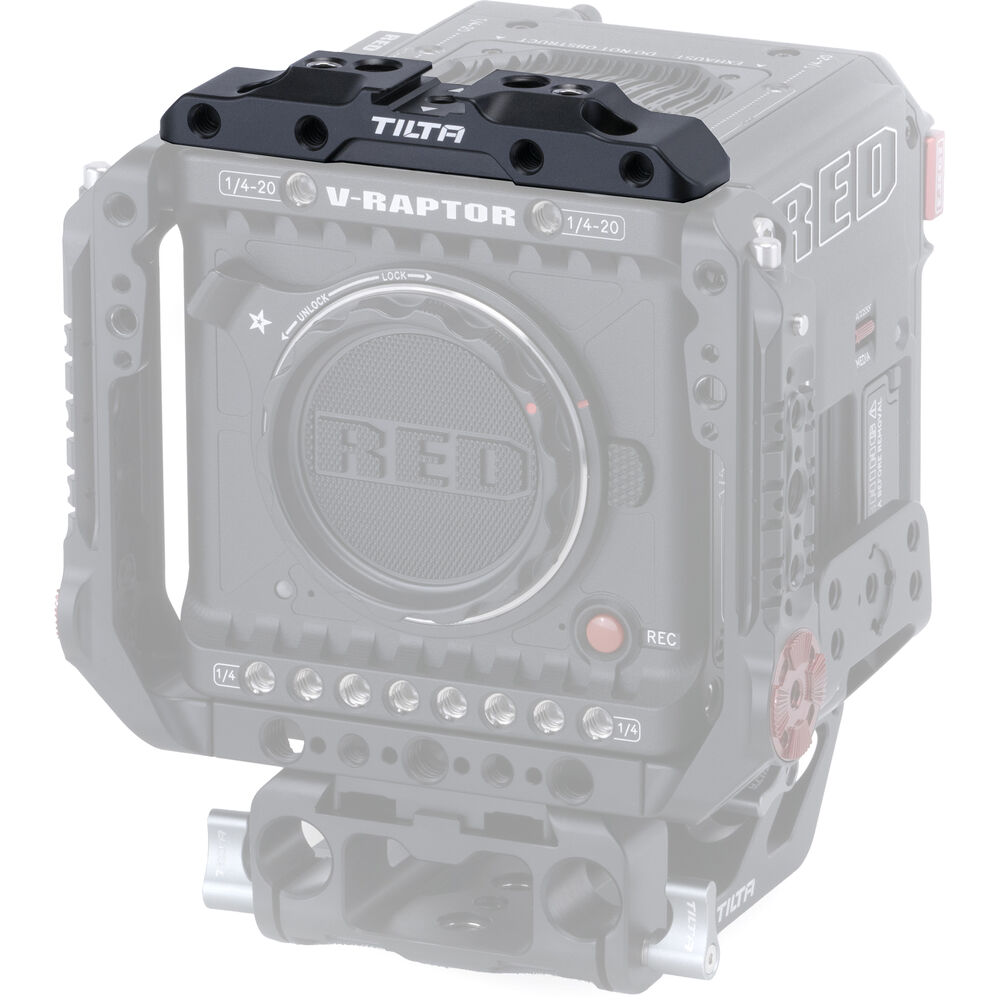 Custom designed to fit the front of your RED V-RAPTOR, the Tilta Front Top Plate expands the mounting options of your camera to accommodate accessories like secondary monitors and articulating arms thanks to multiple 1/4"-20 and 3/8"-16 threads. A built-in cold shoe mount is compatible with a shotgun microphone or wireless mic transmitter.
