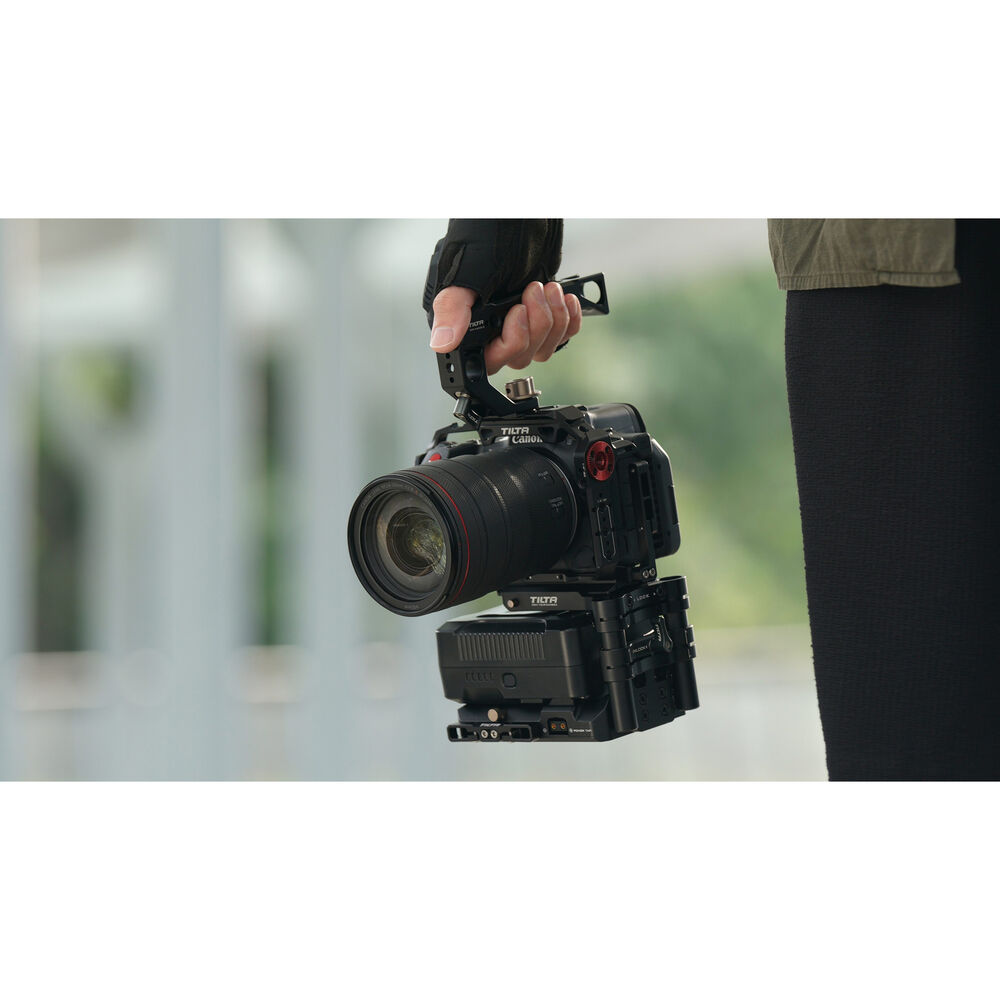 Attach this Tilta Full Camera Cage to your Canon EOS R5 C camera to expand its mounting options and protect the device. Multiple 1/4"-20 threads and three cold shoe mounts allow you to mount articulating arms and wireless microphones on the cage. Several M3 threads, two of which are at the front of the cage, can accept accessories such as the included EF lens mount adapter support.