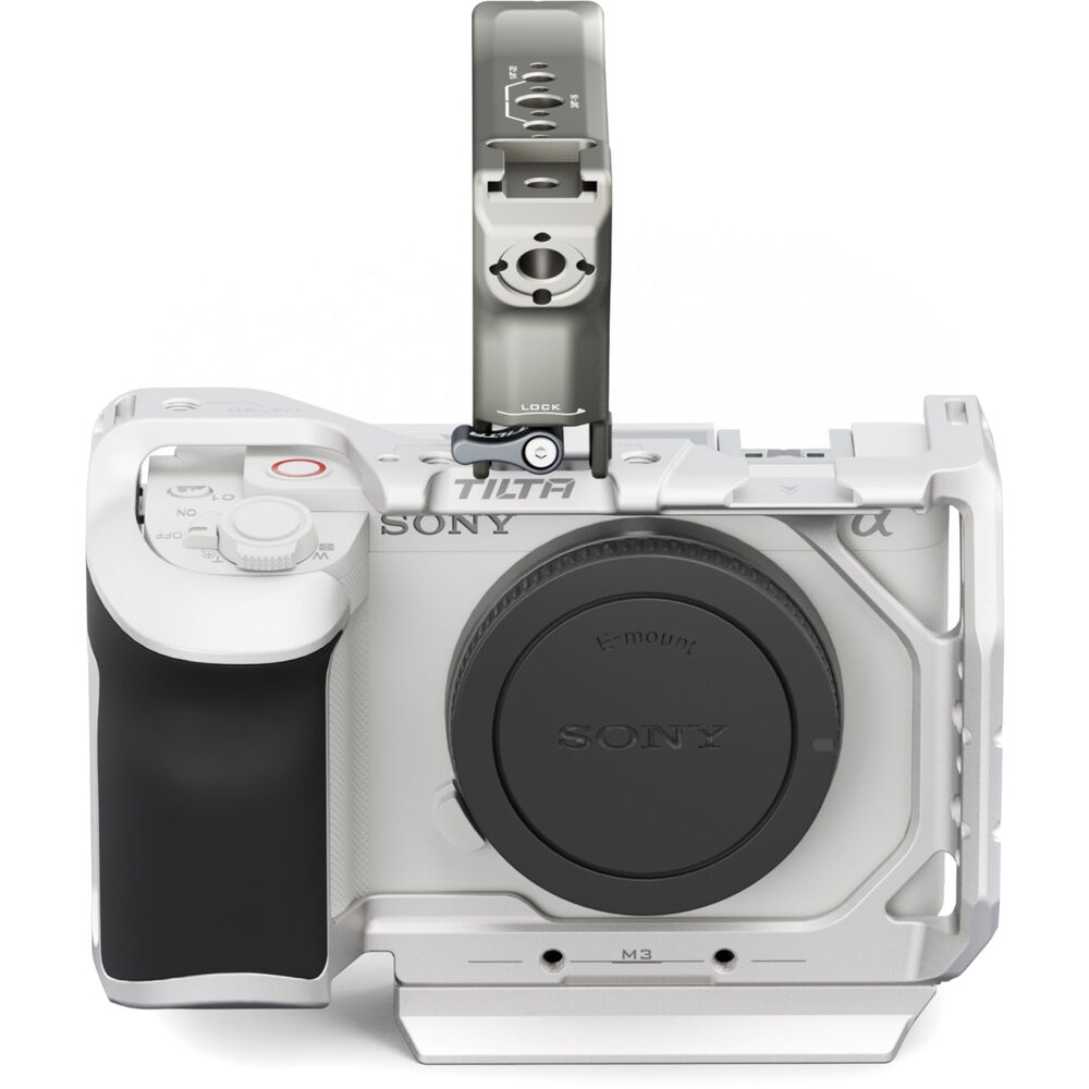 Outfit your Sony ZV-E1 camera with this silver Tilta Full Camera Cage Lightweight Kit to provide additional protection to your device while expanding its mounting options. Included in the kit are a full camera cage, a NATO top handle, and a 1/4"-20 screw to NATO rail adapter to mount the handle on the cage. Multiple 1/4"-20 anti-twist threads, M3 threads, a cold shoe slot, and NATO rail offer mounting points for articulating arms, external monitors, and shotgun microphones.