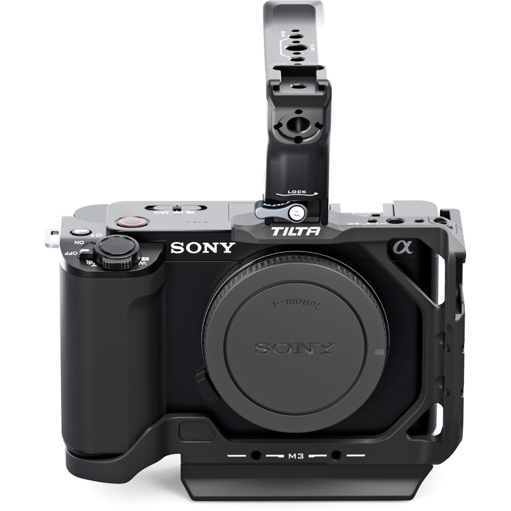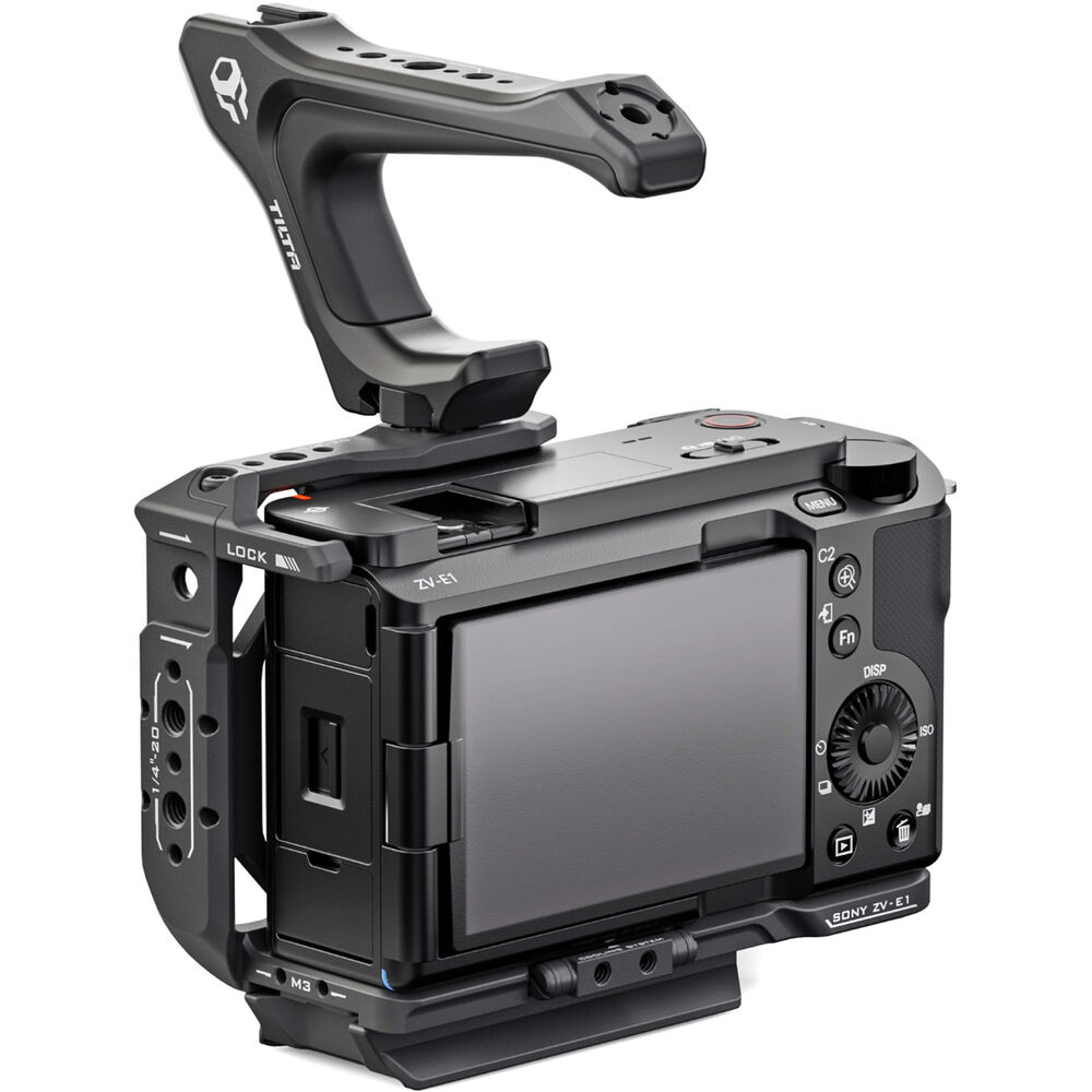 Outfit your Sony ZV-E1 camera with this black Tilta Half Camera Cage Lightweight Kit to provide additional protection to your device while expanding its mounting options. Included in the kit are a half camera cage, a NATO top handle, and a 1/4"-20 screw to NATO rail adapter to mount the handle on the cage. Multiple 1/4"-20 anti-twist threads, M3 threads, a cold shoe slot, and NATO rail offer mounting points for articulating arms, external monitors, and shotgun microphones.