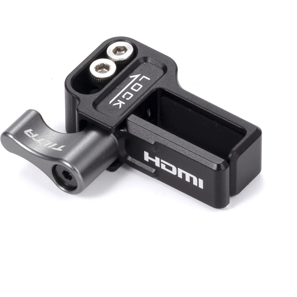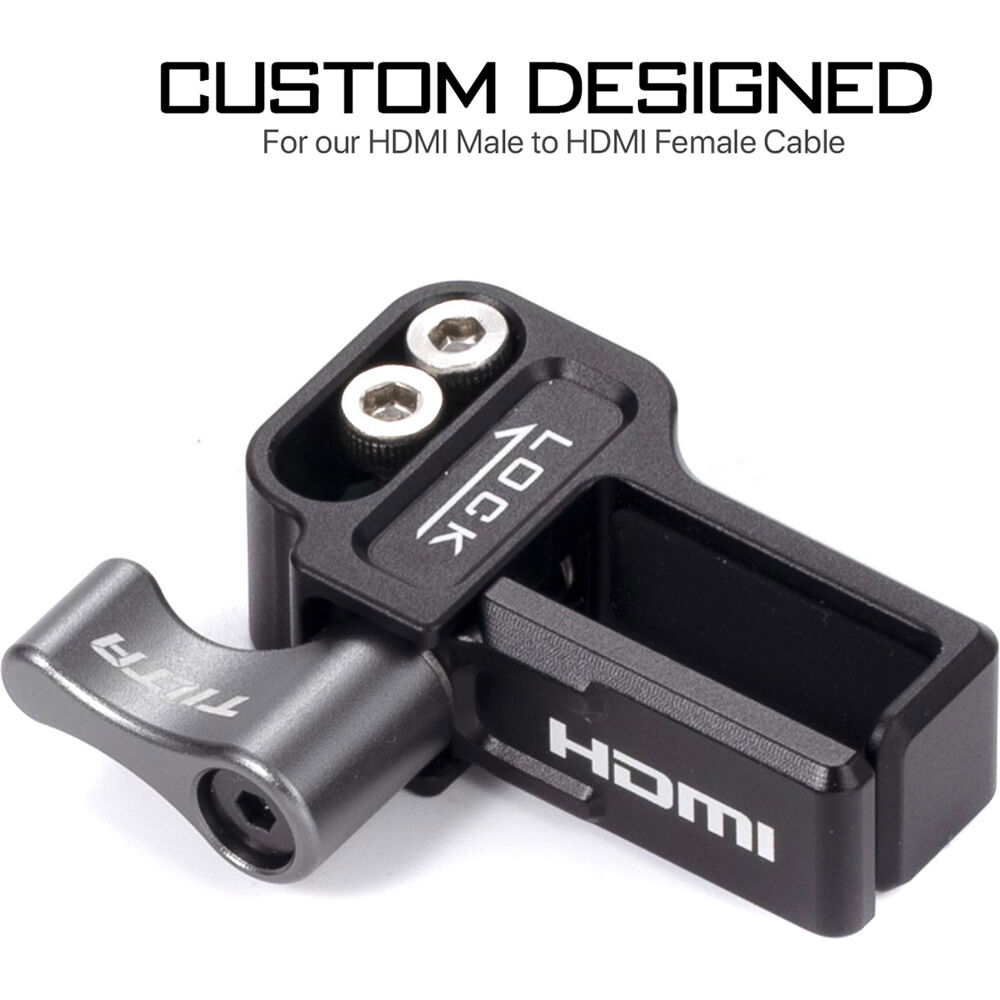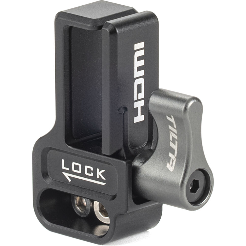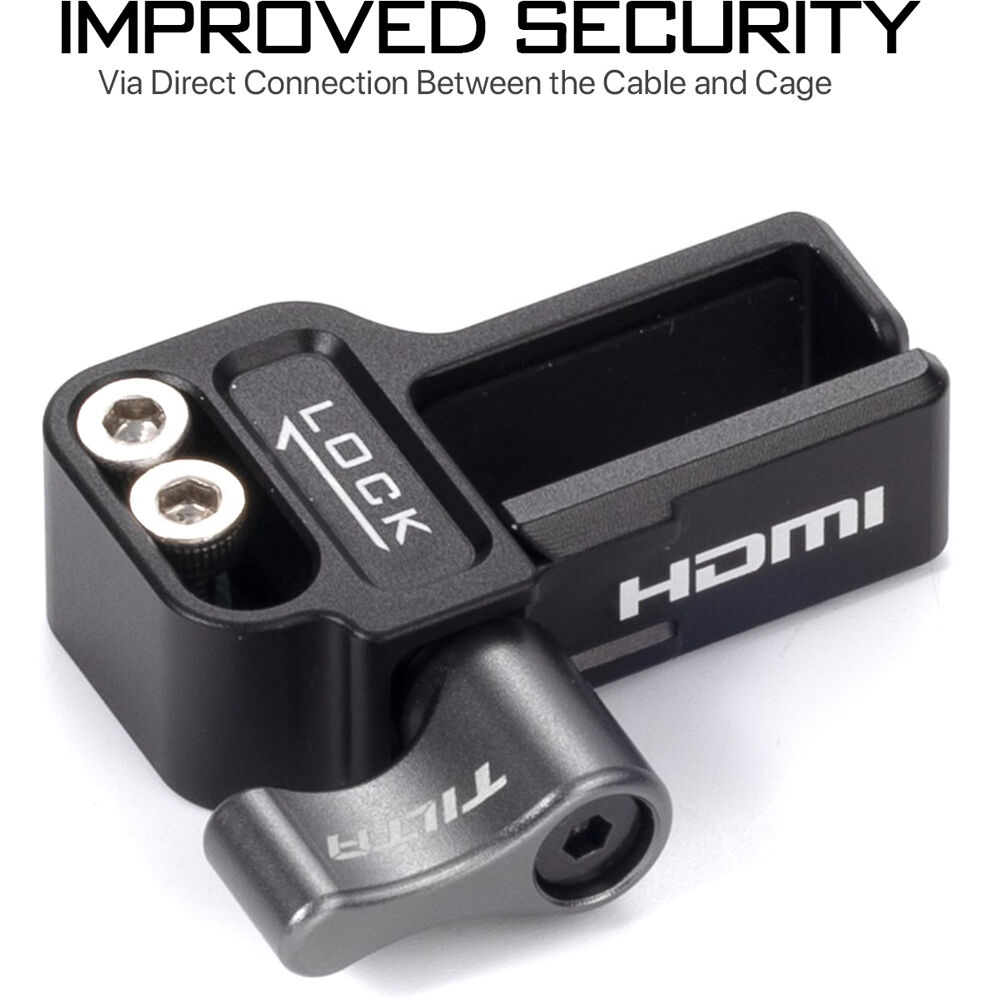 Secure your HDMI cables to your caged GH6 with the HDMI Clamp Attachment for Panasonic GH6 from Tilta. Its thumbscrew tightens the vice around the cables, helping to ensure that they maintain a usable connection with the GH6's ports.