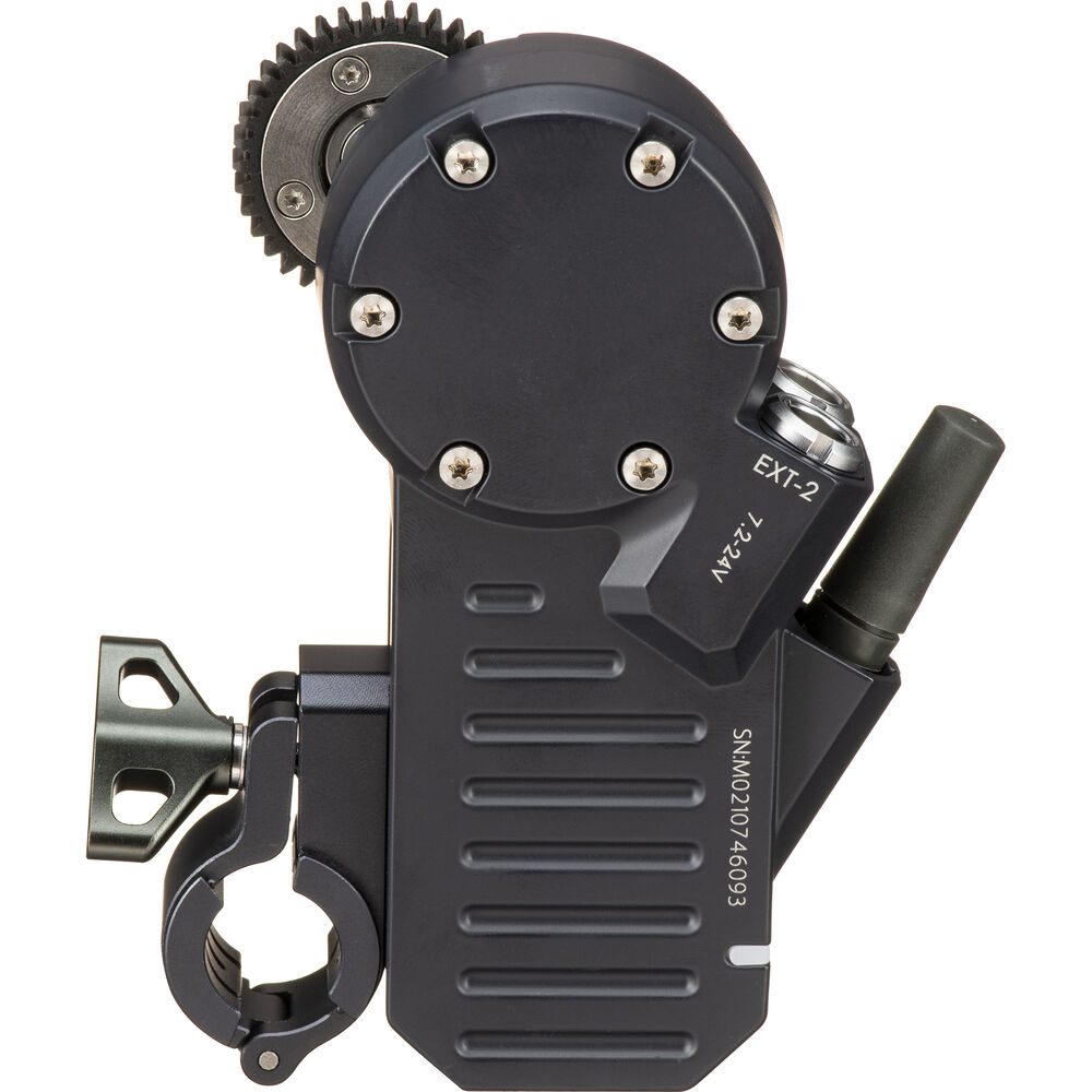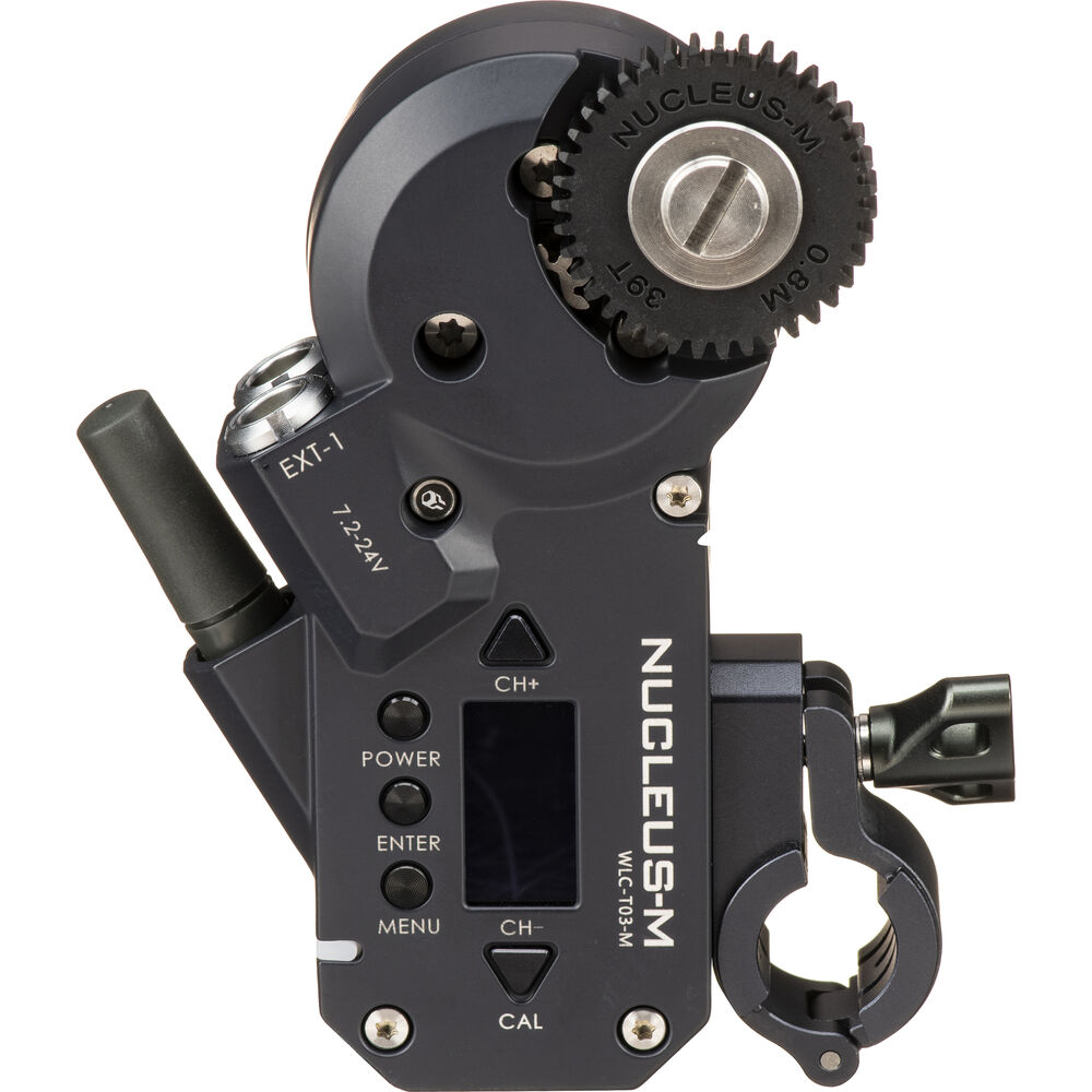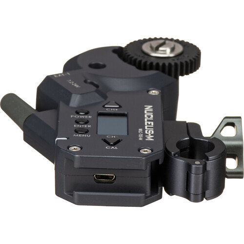 The Nucleus-M wireless motor includes a cine standard 0.8 Mod drive gear and a 19mm rod adapter with a bushing for mounting onto a 15mm rod. The motor features automatic or manual calibration, a display window, and high, medium, and low torque settings.