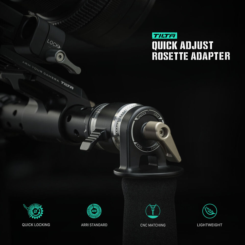 Integrate this Tilta Quick Adjust Rosette Adapter to the right-side of your Tilta rig or DJI gimbal rosette mount and convert your ARRI rosettes to quick-adjusting mounts. The adapter features dual mounts to attach to your rosette of your choice and compatible handle. An adjustment lever allows you to rotate your mounted handle without loosening any screws.