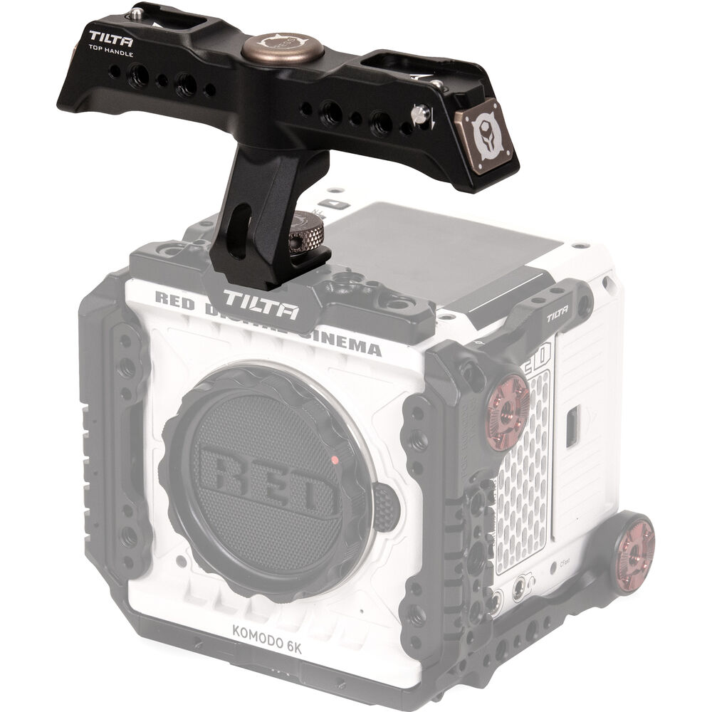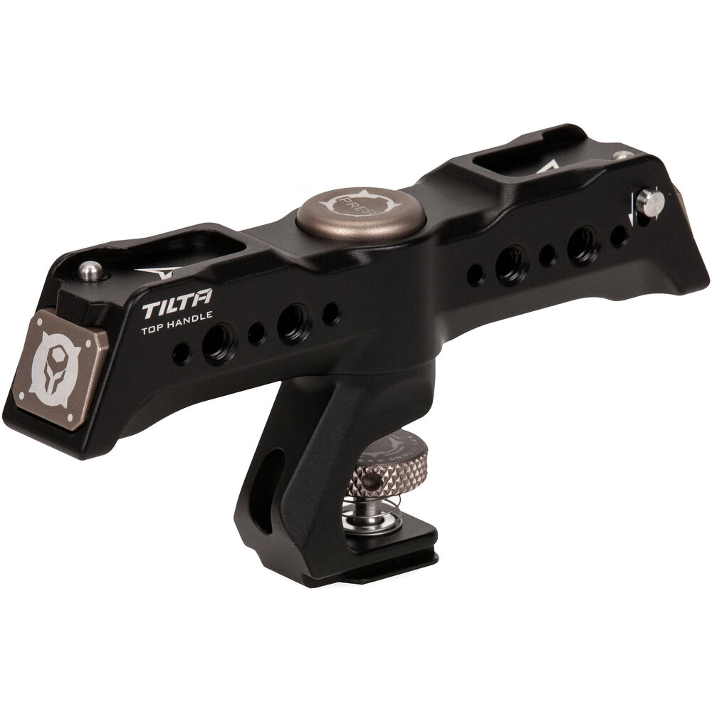 The Rotatable Quick-Release Top Handle from Tilta enables you to quickly select the handle orientation you prefer. This black handle rotates 90° with the push of a button and attaches securely to your camera or cage's cold shoe mount using a locking thumbscrew.