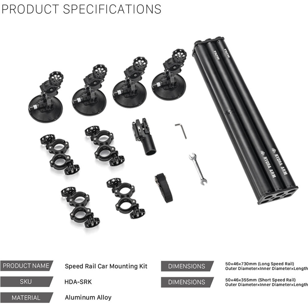 The Tilta Speed Rail Car Mounting Kit arms your vehicle with an advanced car-mounting system compatible with the Hydra Predator and other car-mounted shock-absorbing arms. It includes the Tilta Speed Rail Set, Mounting Clamp Set, Mounting Suction Cup Kit, Front Tow Hook Adapter, Hard Shell Case, and a safety belt.