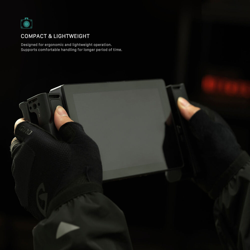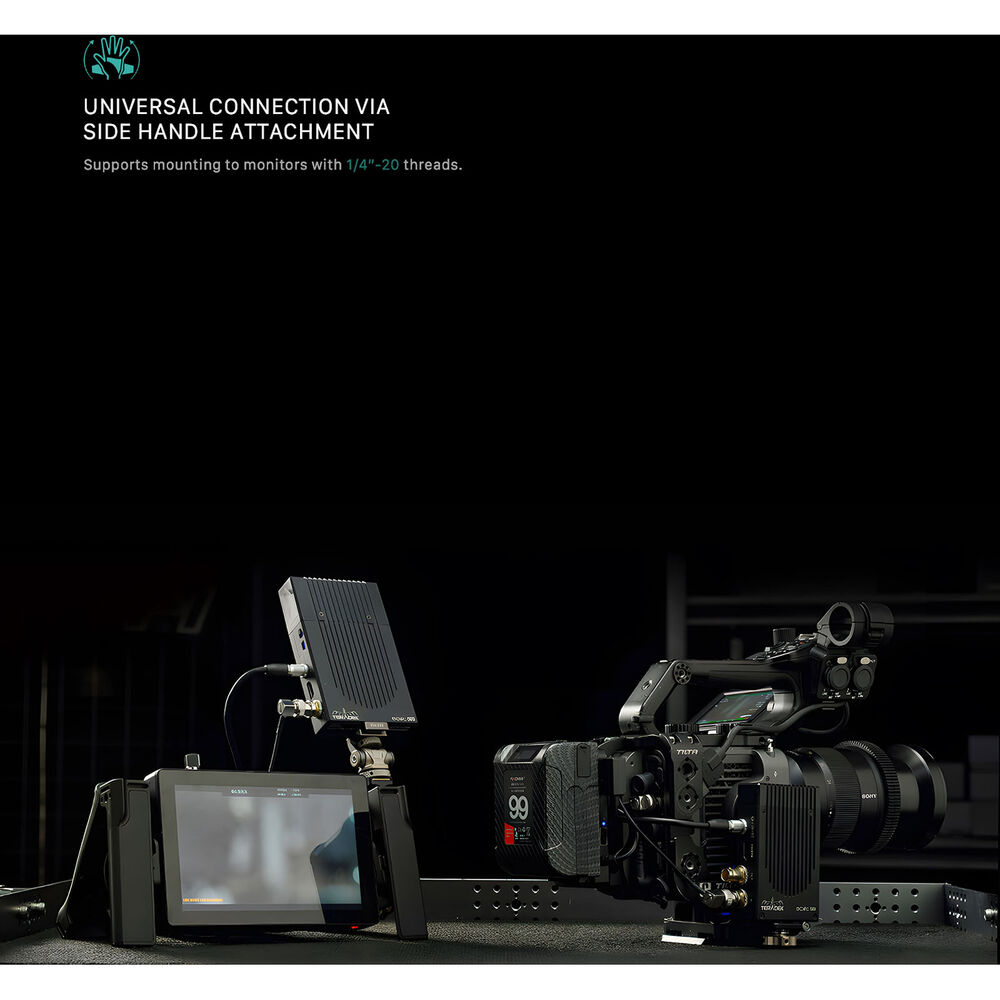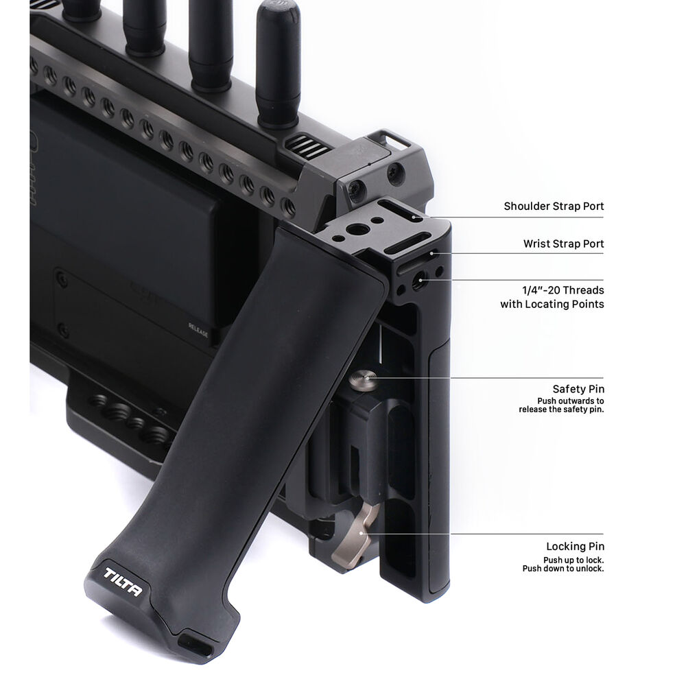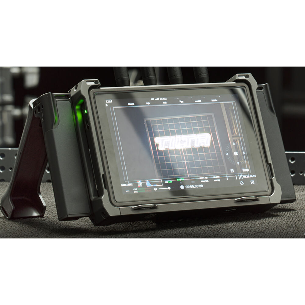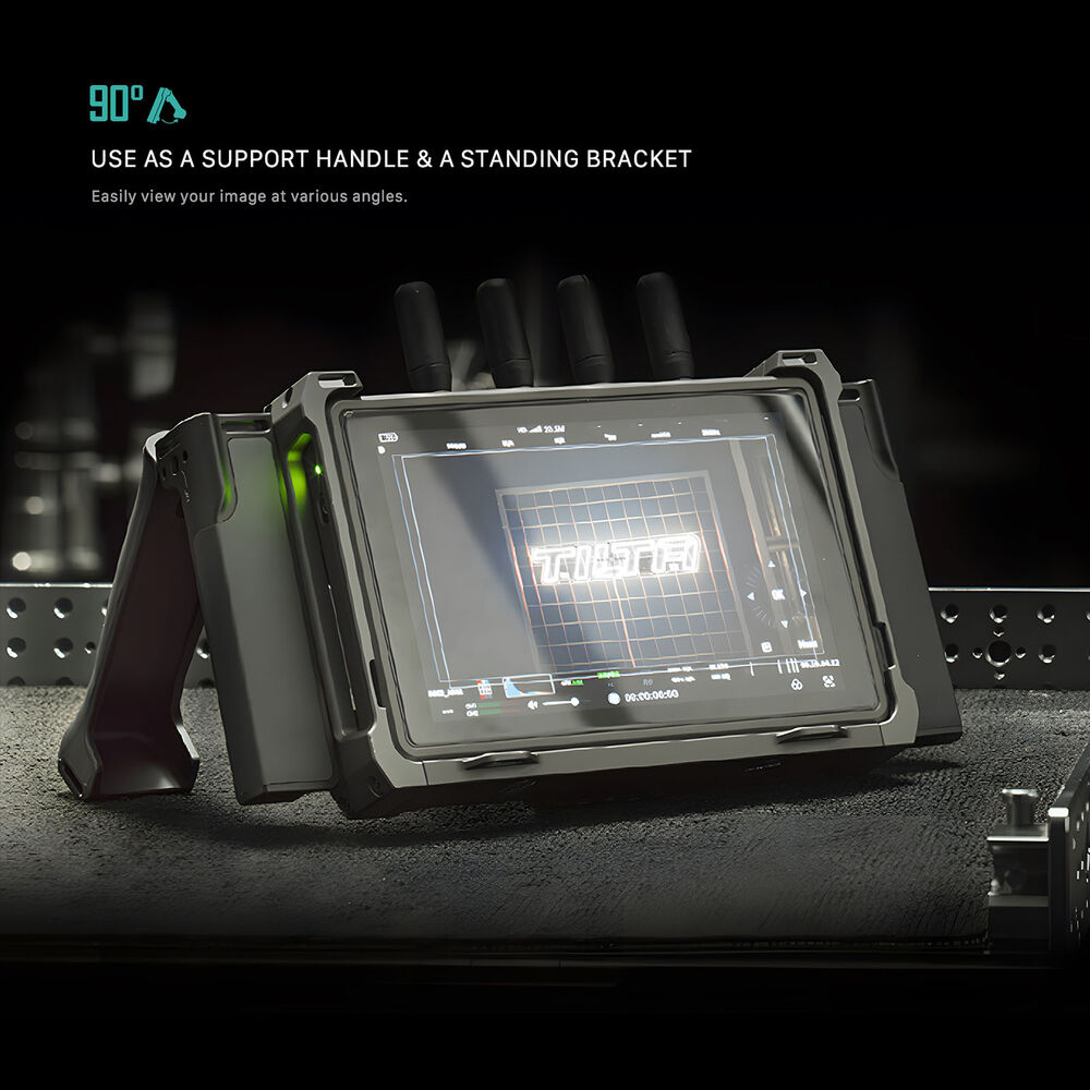 The handles open up to create a stand so you can set your monitor down on a surface at an angle. They also feature a soft silicone grip for comfortable hand-holding. There are multiple 1/4"-20 threads on the top and sides so you can add additional accessories, and strap slots allow you to add separately available shoulder or wrist straps.