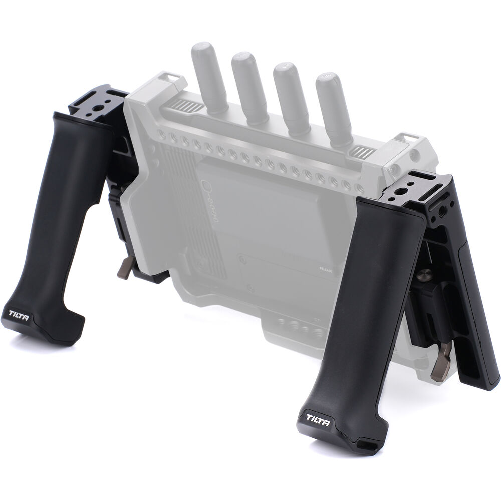 Add handles to your DJI 7" High-Bright Remote Monitor to create a handheld roaming director's monitor with this Support Handles Kit from Tilta. The handles mount onto the side of the monitor using the included mounting attachment with 1/4"-20 screws, and they provide stable handheld support on the right and left side of the monitor. They have an adjustment range of up to 1.3".