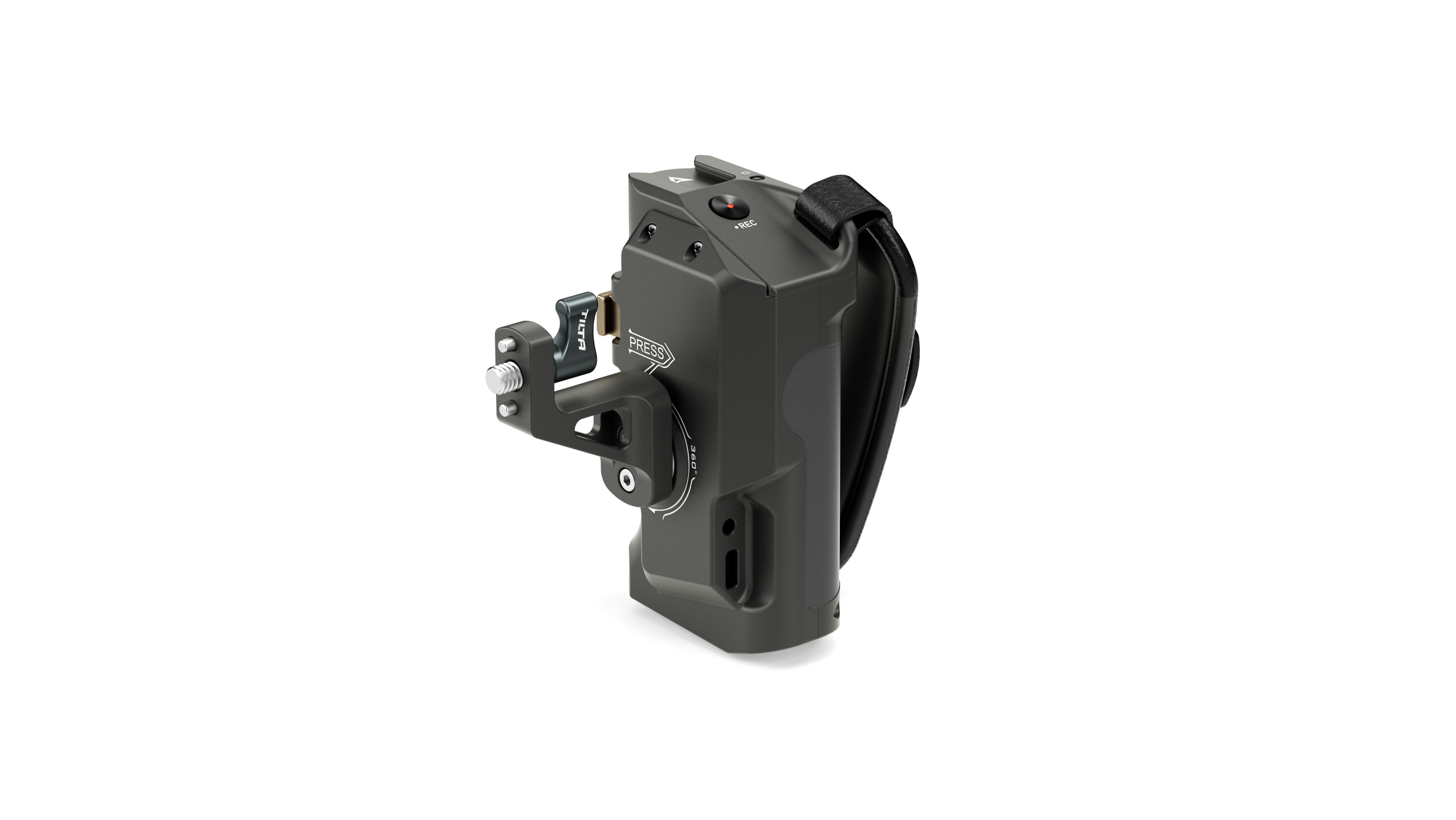 This advanced handle attaches to the right side of Tiltaing camera cages. A battery port on the bottom of the handle allows you to use a Sony F570 battery to power various accessories via the 8V USB-C and 12V DC power outputs.
