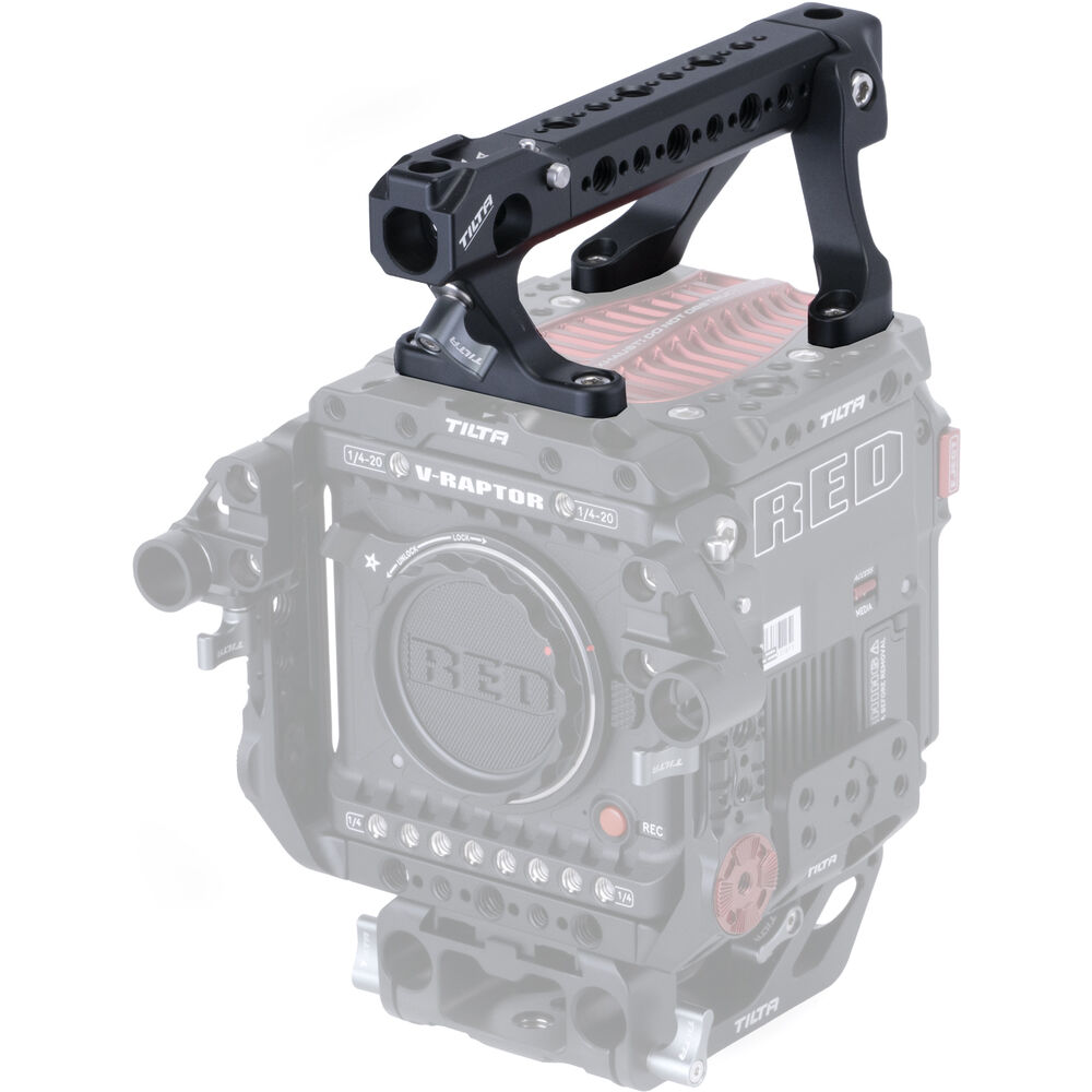 Secure a cheese plate-style handgrip to the top of your RED V-RAPTOR camera cage via four built-in 1/4"-20 screws with the Tilta Top Handle to add more mounting options to your rig. Multiple 1/4"-20 and 3/8"-16 threads on the handle allow you to mount articulating arms and secondary monitors. A single cold shoe mount and 15mm rod compatibility expand these mounting capabilities even more to shotgun microphones and transmitters. The handle is made up of aluminum alloy and steel for a durable and lightweight design.