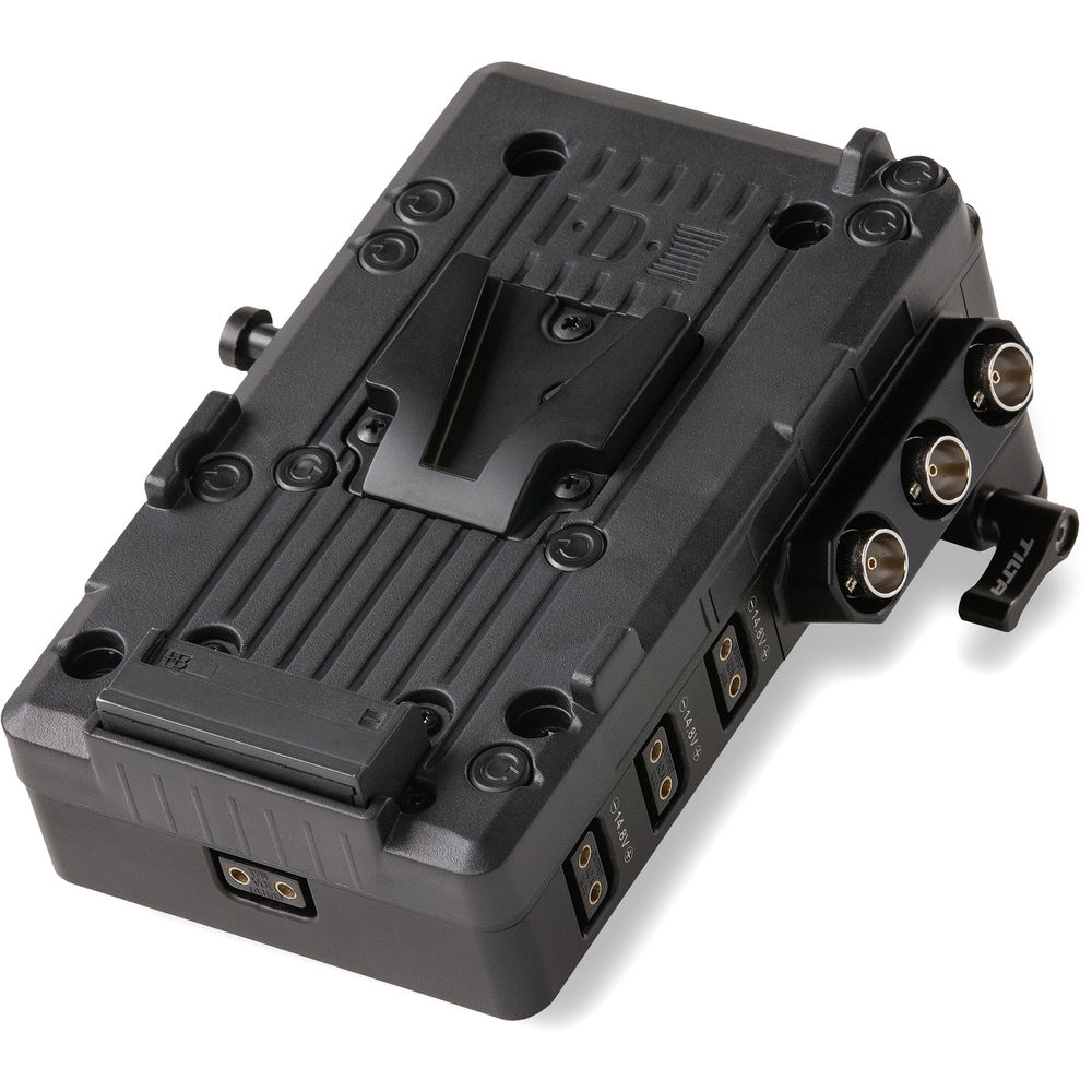 The plate passes through your battery's power to five 14.8V D-Tap outputs, one 14.8V 2-pin LEMO-type output, and one 14.8V 3-pin Fischer output. The plate also features one BNC SDI input and two BNC SDI outputs. The plate attaches to your camera, cage, or rig using the included 15mm LWS adapter and clamp.