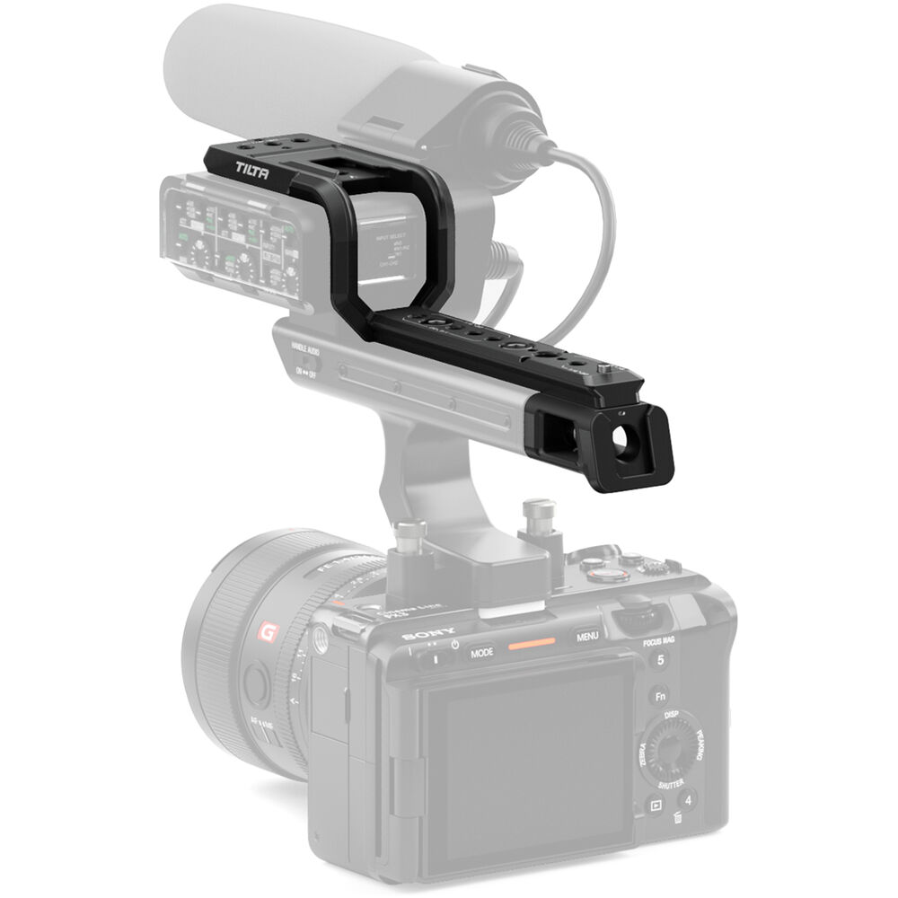 Use your Sony XLR-H1 top handle unit with your FX3 or FX30 without sacrificing mounting space thanks to the black Tilta XLR Extension Bracket. The bracket is designed to perfectly hug the top handle while adding an extension to its length to accommodate camera loads with larger lenses. Multiple 1/4"-20 and 3/8"-16 threads throughout the bracket, two cold shoe mounts, and a NATO rail with a safety pin allow you to attach external monitors, shotgun microphones, or other accessories to your rig. Four built-in screws secure the bracket to your top handle.