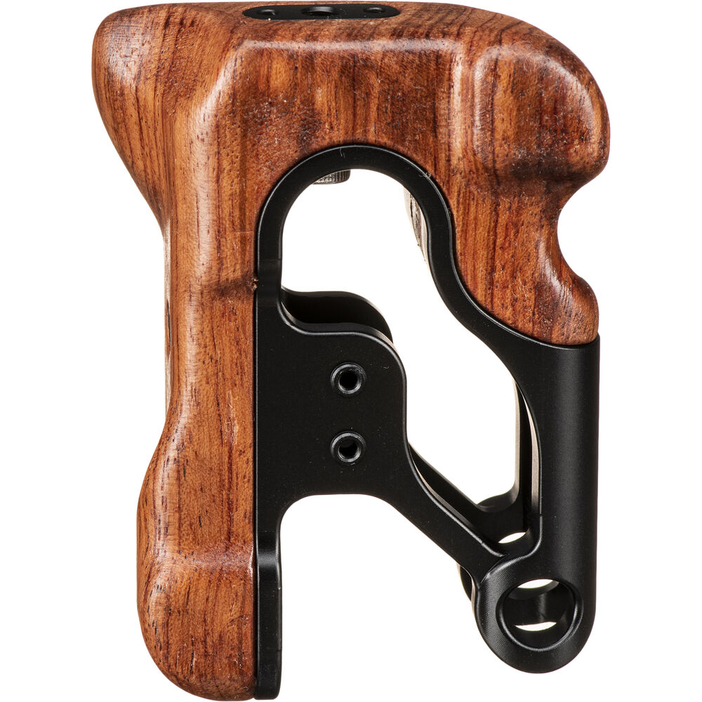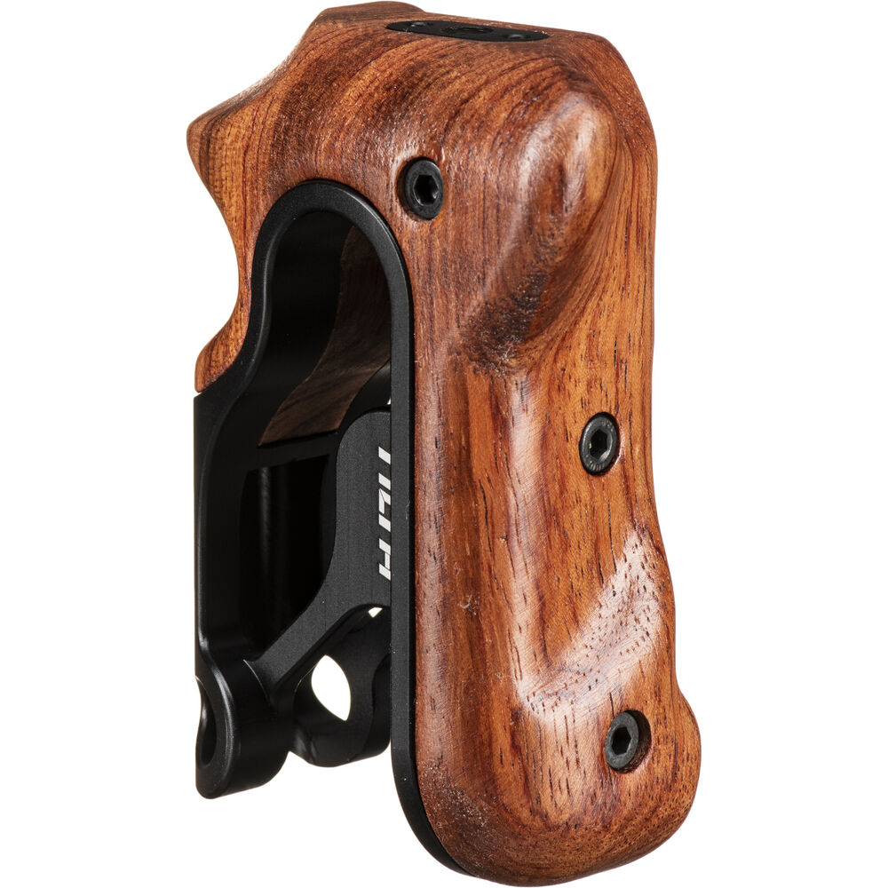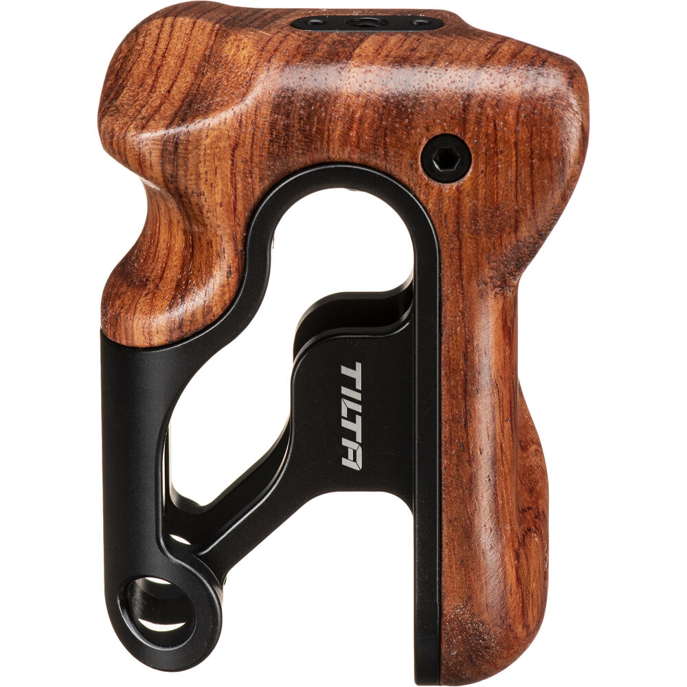 This Black Tiltaing Wooden Handle from Tilta is a contoured handle designed to mount onto the left side of your Tiltaing camera cage. Made with a comfortable wooden grip, this legacy handle requires a separately available adapter to mount onto your cage.