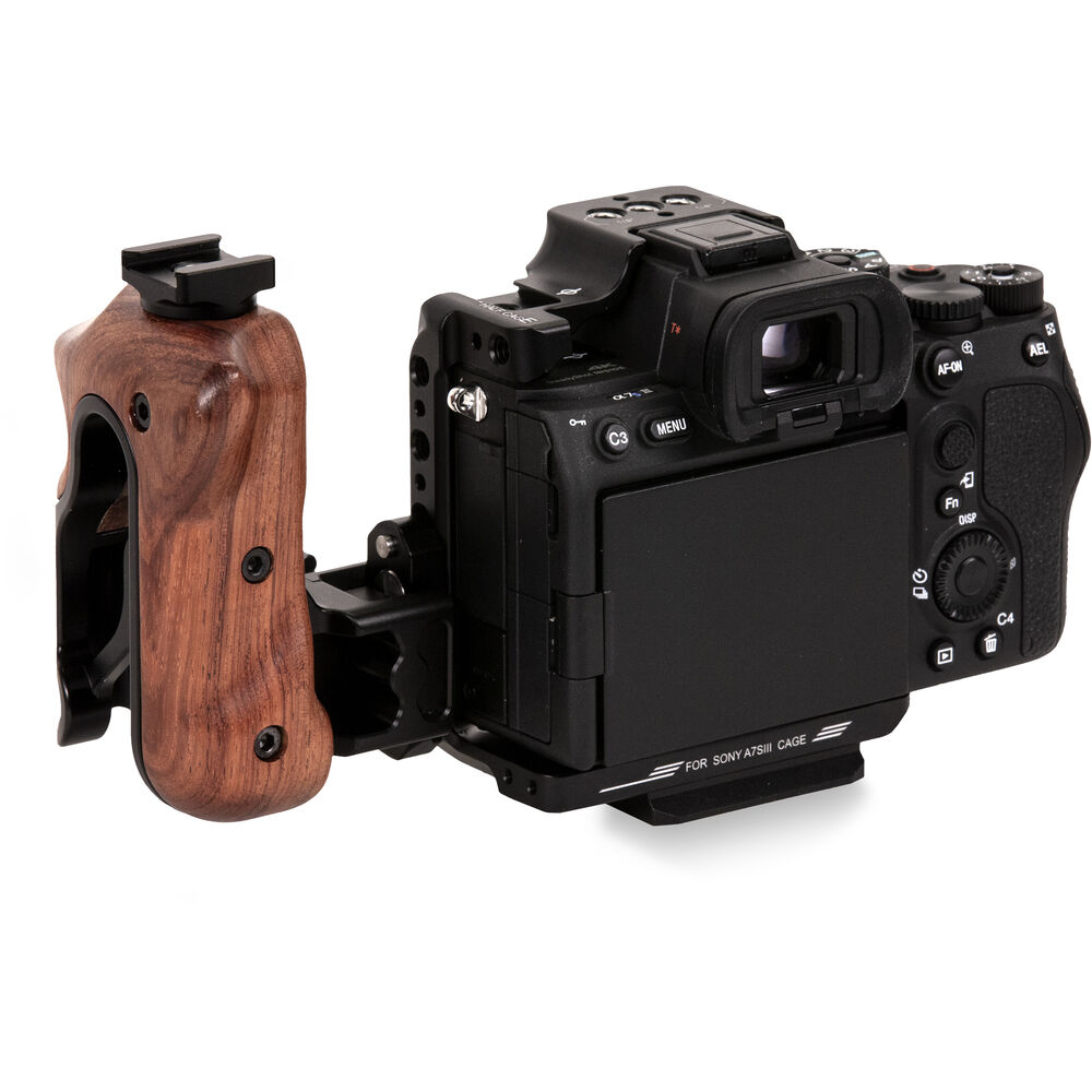 Add protection, handheld operation, and additional accessories to your Sony a7S III mirrorless camera with this black Tiltaing Lightweight Kit from Tilta. The kit includes a formfitting camera half cage, a NATO rail attachment, a shoe mount attachment, and a left-side wooden handle with quick release cage attachment.